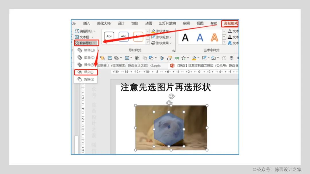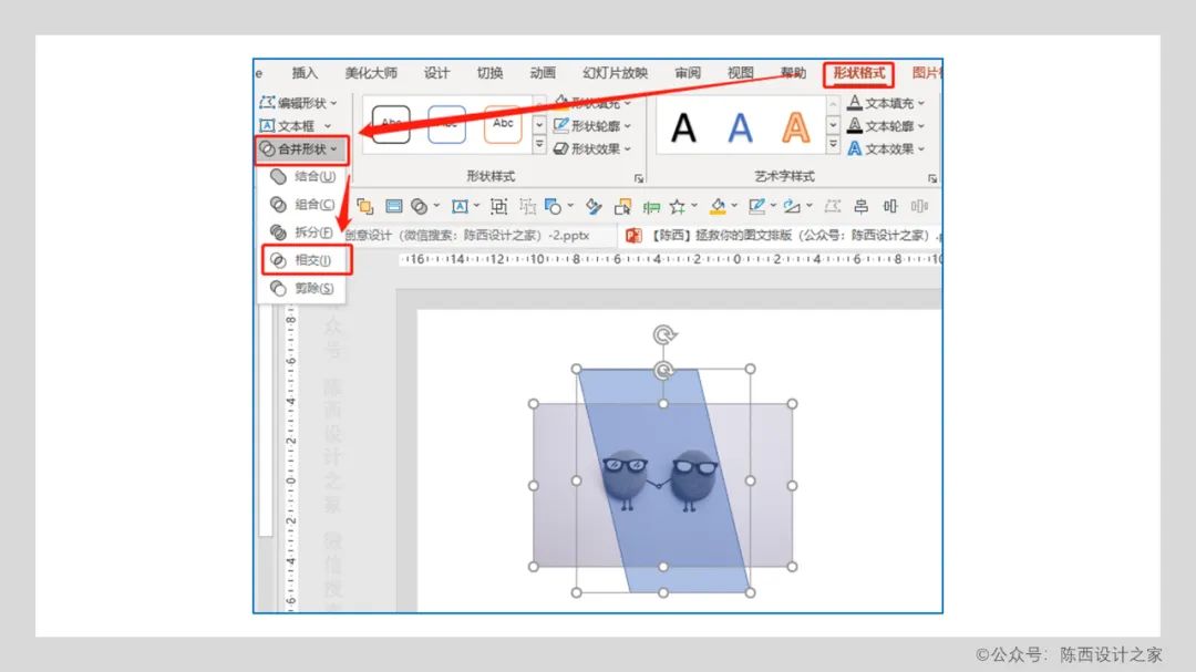 注意:需要先选中图片,再按住Ctrl键点击选中平行四边形。两者选中之后,点击合并形状,相交。这样就可以得到我们需要的图片效果了。