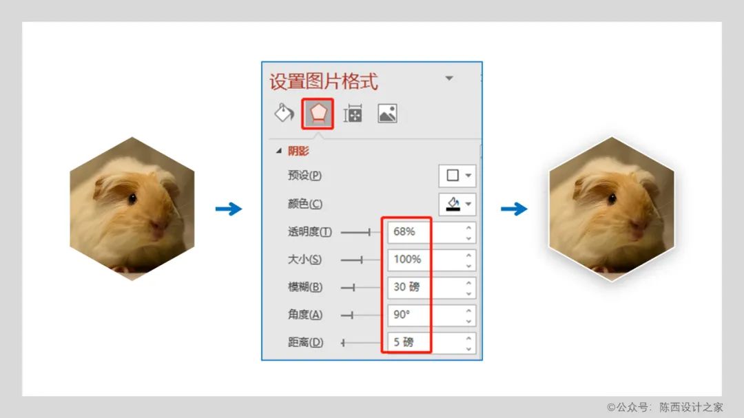 给六边形图片添加一个白色的边框,然后设置阴影的效果。阴影参数可以参考上图。