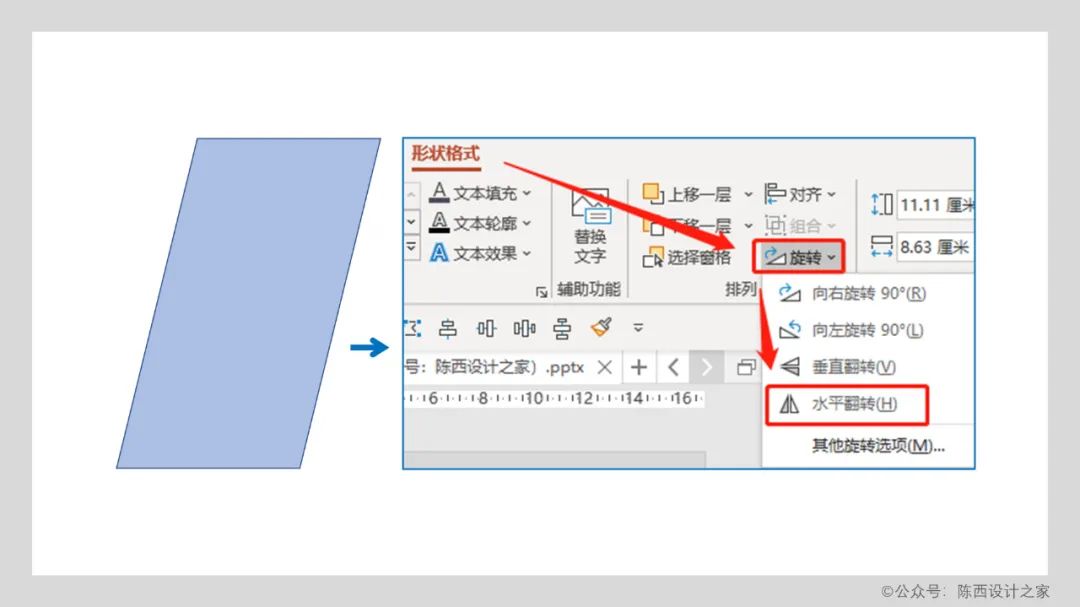 在形状里面找到平行四边形,绘制一个平行四边形,选中平行四边形在形状格式里面,旋转里面点击水平翻转。