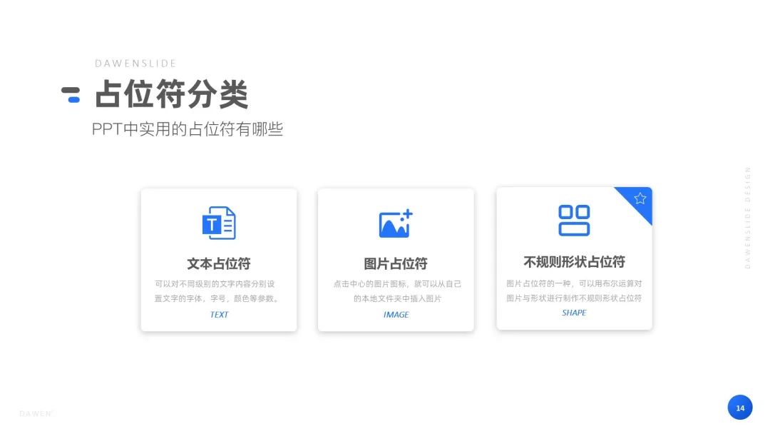 根据PPT的逻辑与实际应用,我们可以将占位符分为:文字、图片、形状三大类。