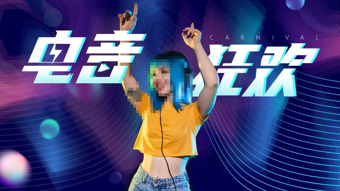 下面这个案例,文本部分也用到了布尔运算。首先将“电音狂欢”进行文字矢量化处理,然后绘制两个平行四边形分别放在“电音”二字上,先选择文字再选择形状,利用布尔运算进行剪除,接下来在空缺的地方放入图标等……