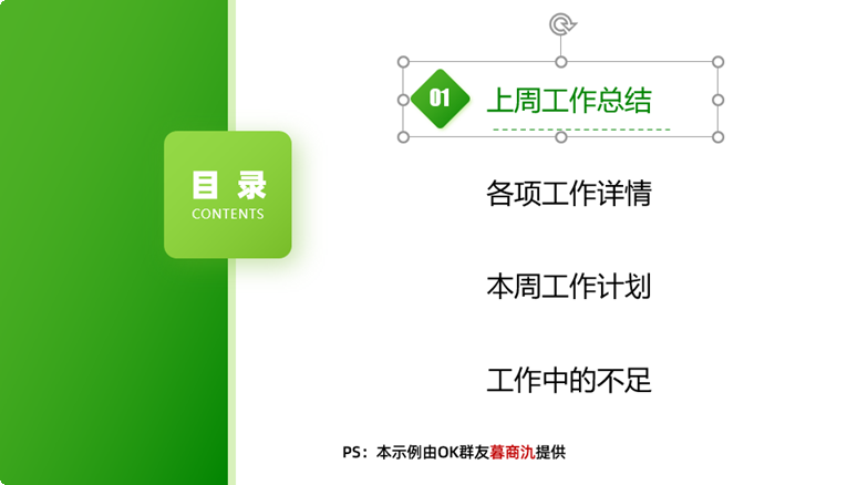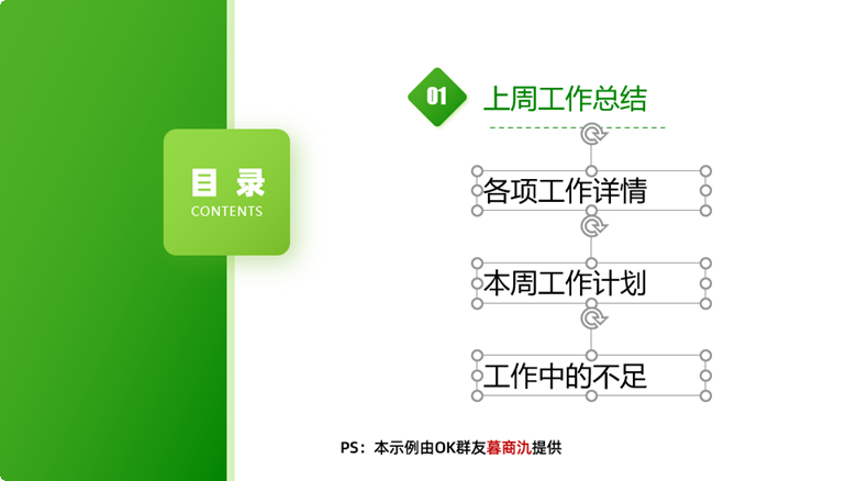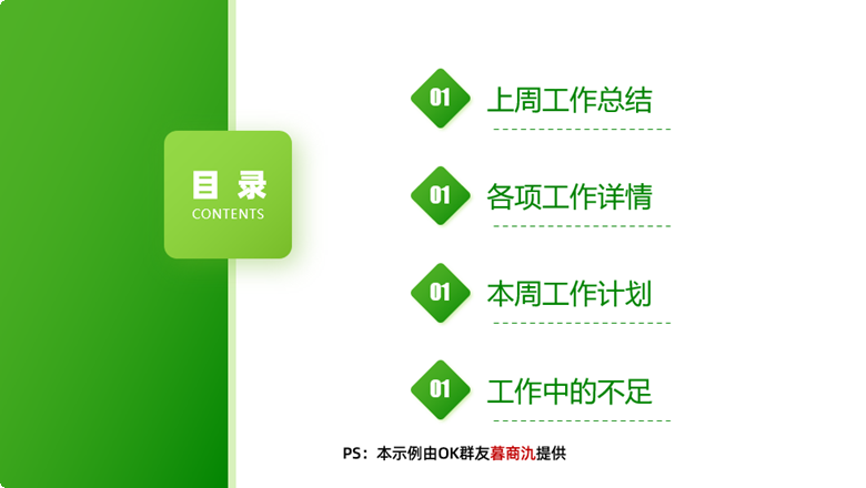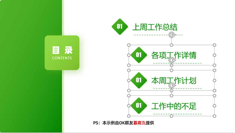 如上图所示,第1组标题包含:1个菱形、1个数字编号、1个标题文本框、1条虚线。而其余标题均只有1个文本框