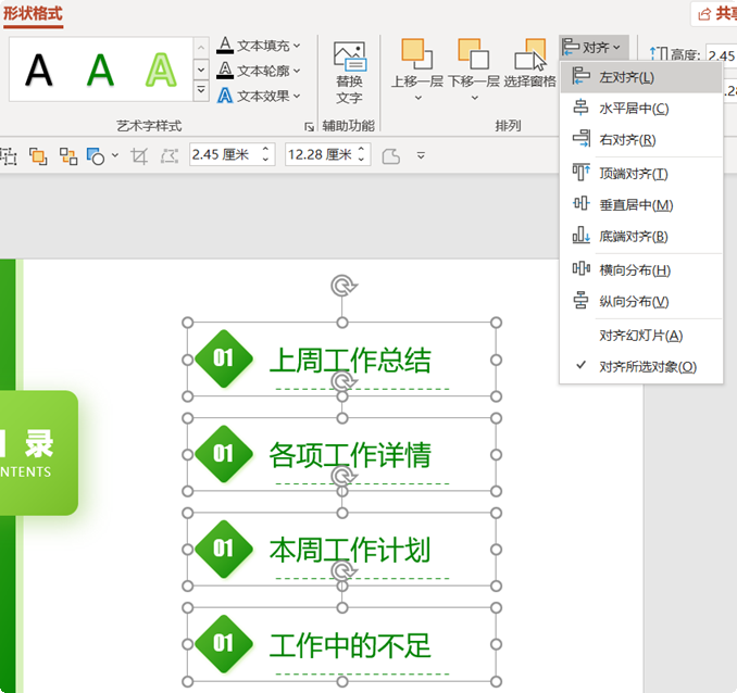 选中所有标题,使用PPT本身的左对齐、纵向分布进行对齐