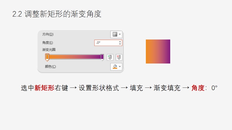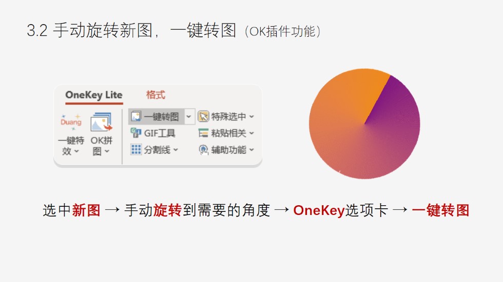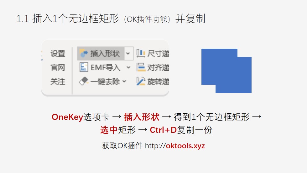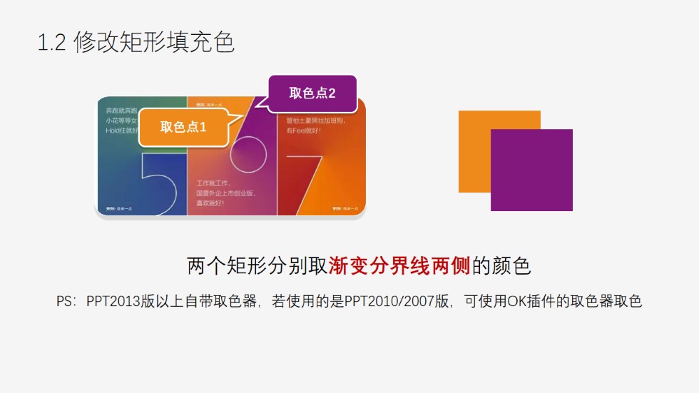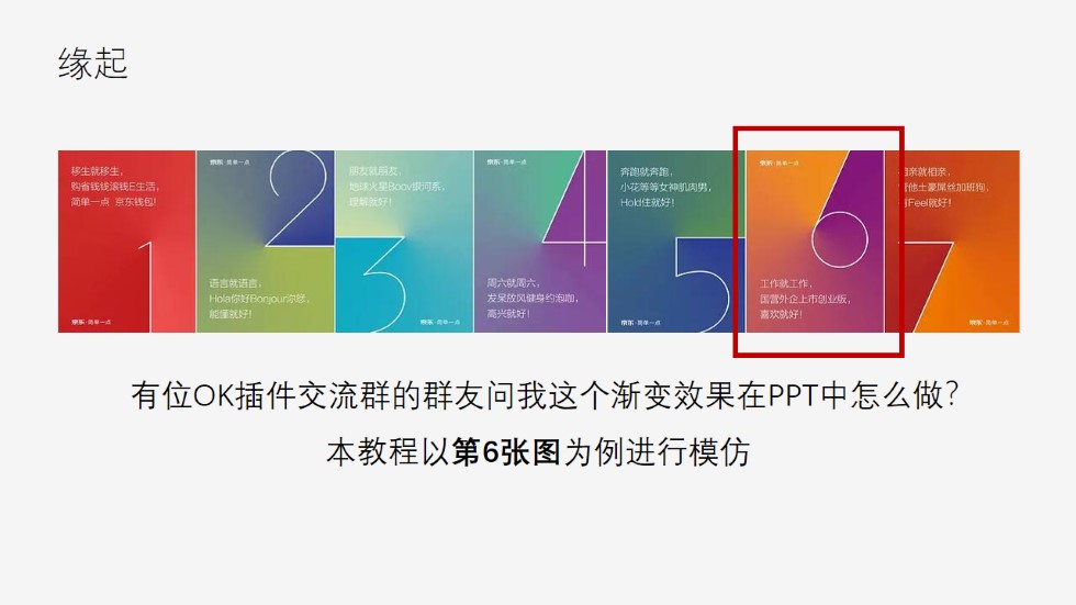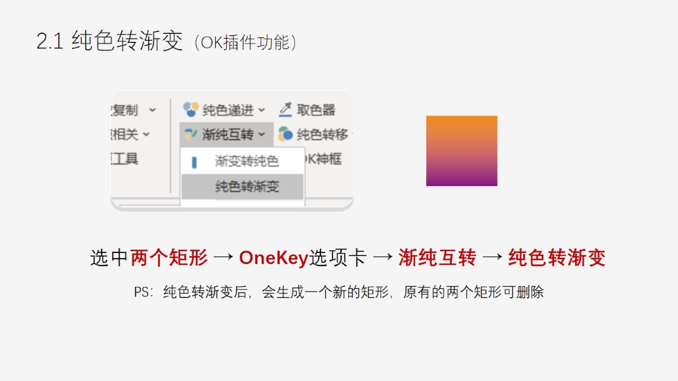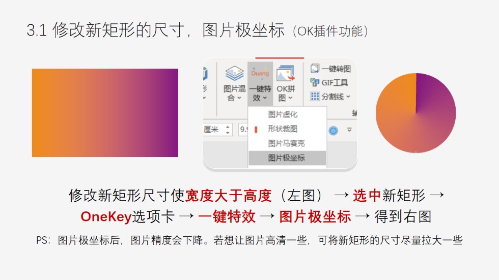 :PPT极坐标渐变:1.1 插入1个无边框矩形(OK插件功能)并复制;1.2 修改矩形填充色2.1 纯色转渐变2.2 调整新矩形的渐变角度;3.1 修改新矩形的尺寸,图片极坐标;3.2 手动旋转新图,一键转图;3.3 裁剪新图;4. 加线条、文字修饰后完成 。