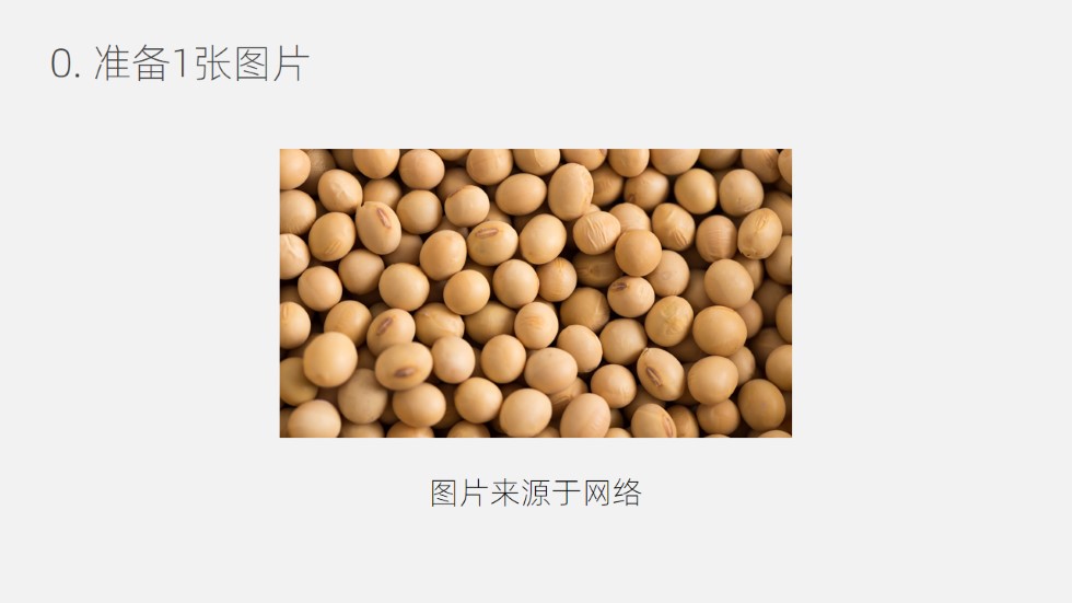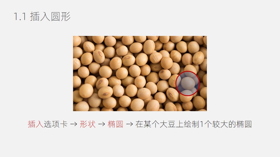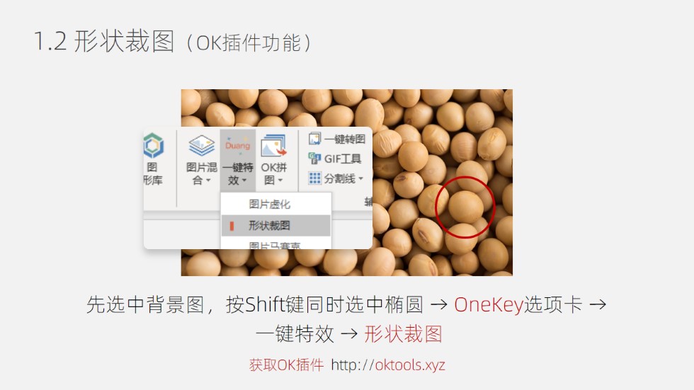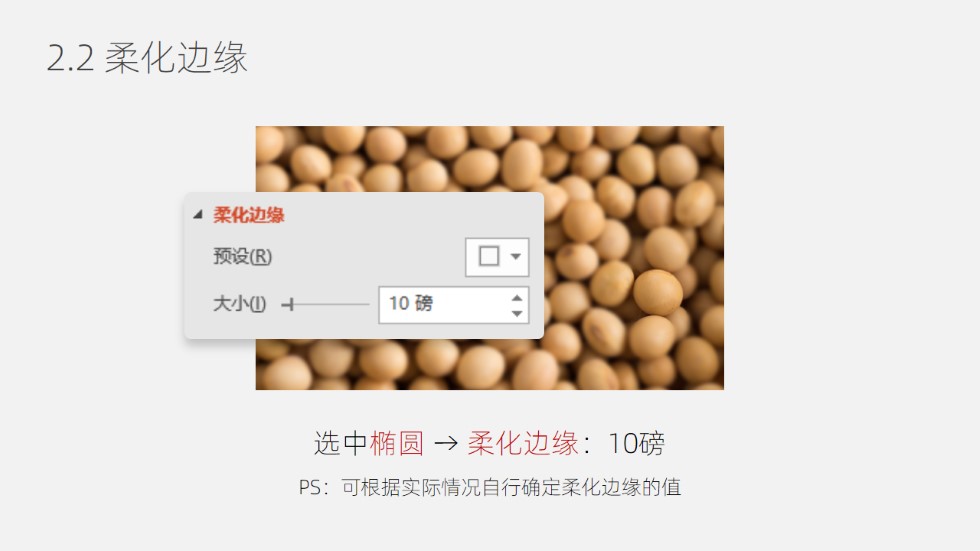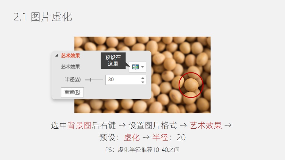 :PPT图片对焦处理-01,0. 准备1张图片;1.1 插入圆形:插入选项卡 → 形状 → 椭圆 → 在某个大豆上绘制1个较大的椭圆;1.2 形状裁图(OK插件功能):先选中背景图,按Shift键同时选中椭圆 → OneKey选项卡 → 一键特效 → 形状裁图;2.1 图片虚化:选中背景图后右键 → 设置图片格式 → 艺术效果 → 预设:虚化 → 半径:20... ...