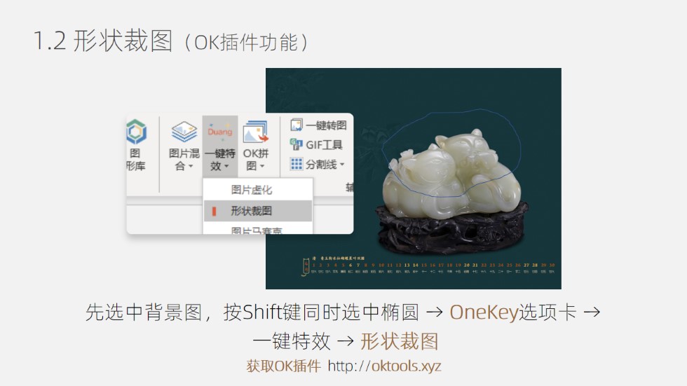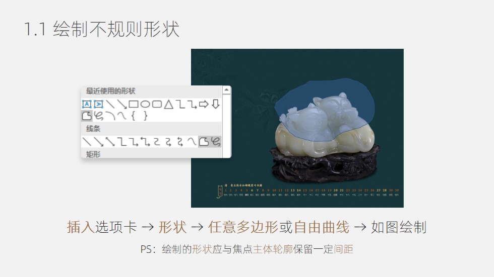 :ppt图片对焦处理,0. 准备1张图片;1.1 绘制不规则形状:插入选项卡 → 形状 → 任意多边形或自由曲线 → 如图绘制 ;1.2 形状裁图(OK插件功能):先选中背景图,按Shift键同时选中椭圆 → OneKey选项卡 → 一键特效 → 形状裁图; 2.1 背景图添加虚化:选中背景图后右键 → 设置图片格式 → 艺术效果 → 预设:虚化 → 半径:5;2.2 顶图提高亮度... ...