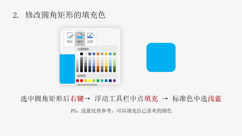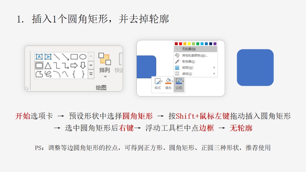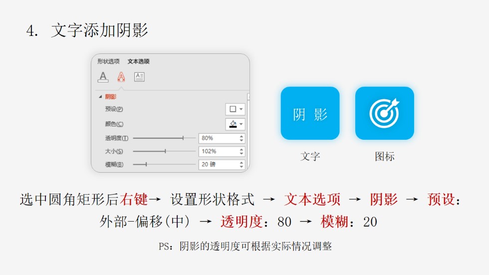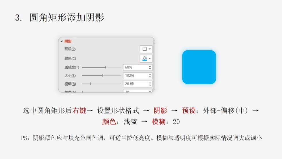 :PPT弥散阴影练习:1. 插入1个圆角矩形,并去掉轮廓;2. 修改圆角矩形的填充色;3. 圆角矩形添加阴影;4. 文字添加阴影。