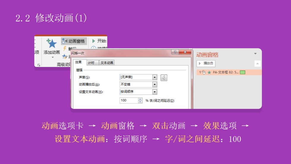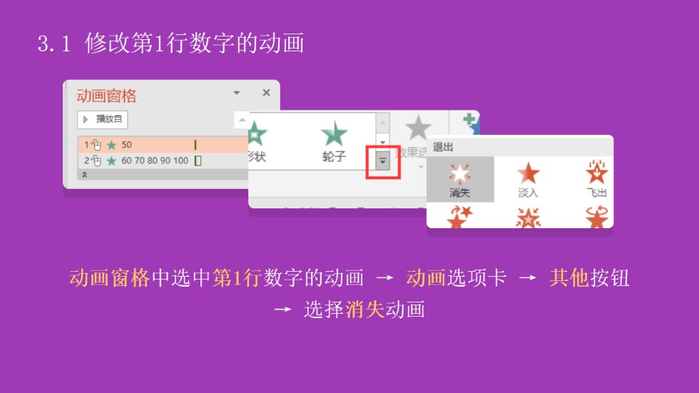 :PPT数字位移递进动画:1. 插入文本框,输入数字;2.1 添加闪烁一次动画(PA插件功能);2.2 修改动画(1);2.3 修改动画(2);3.1 修改第1行数字的动画;3.2 修改第2行数字的动画;4. 修改文本框行距;完成。