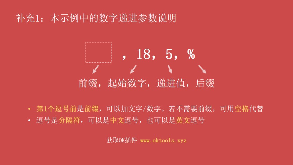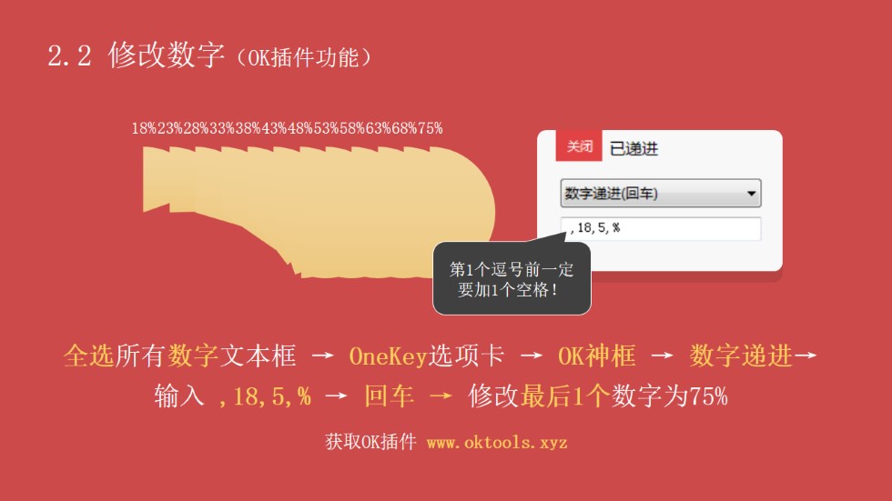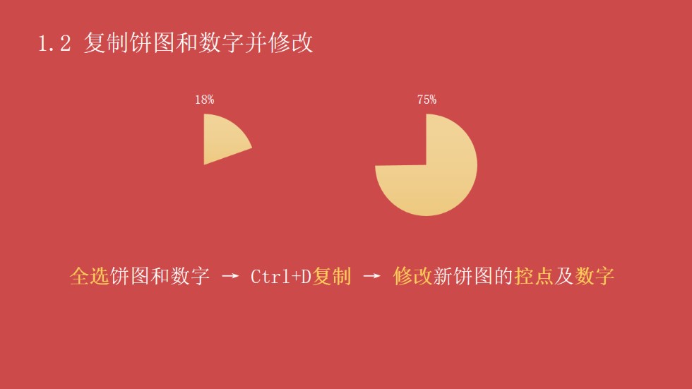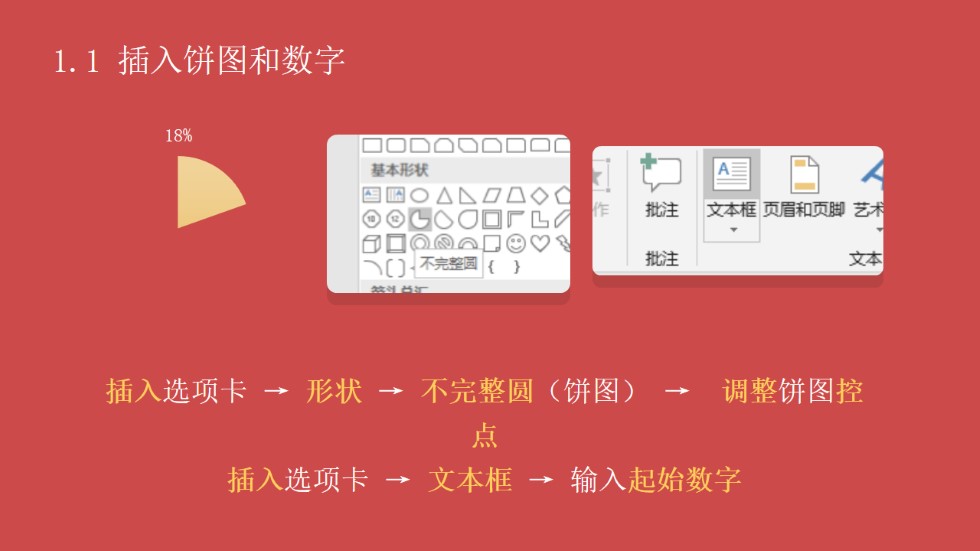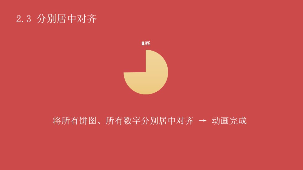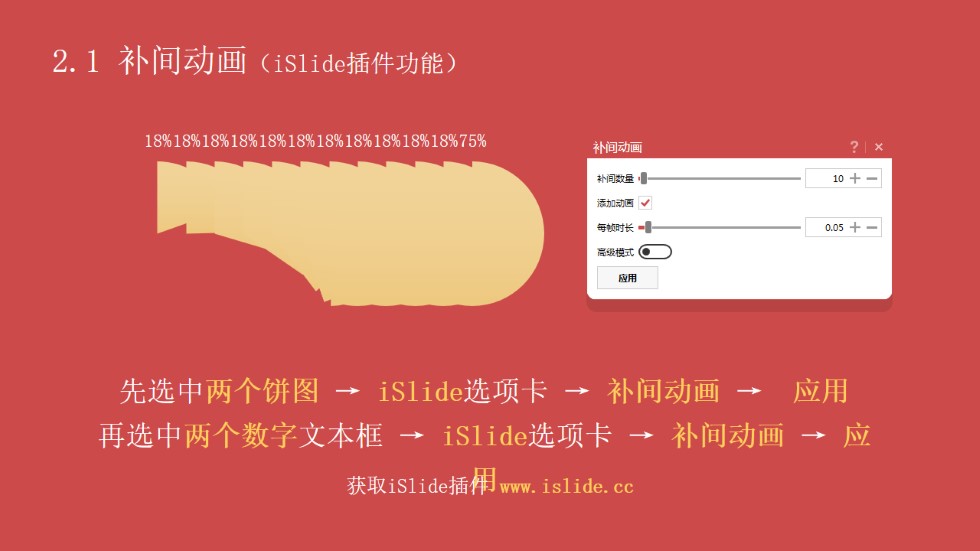 :PPT逐帧递进动画:1.1 插入饼图和数字;1.2 复制饼图和数字并修改;2.1 补间动画(iSlide插件功能);2.2 修改数字(OK插件功能);2.3 分别居中对齐;完成。