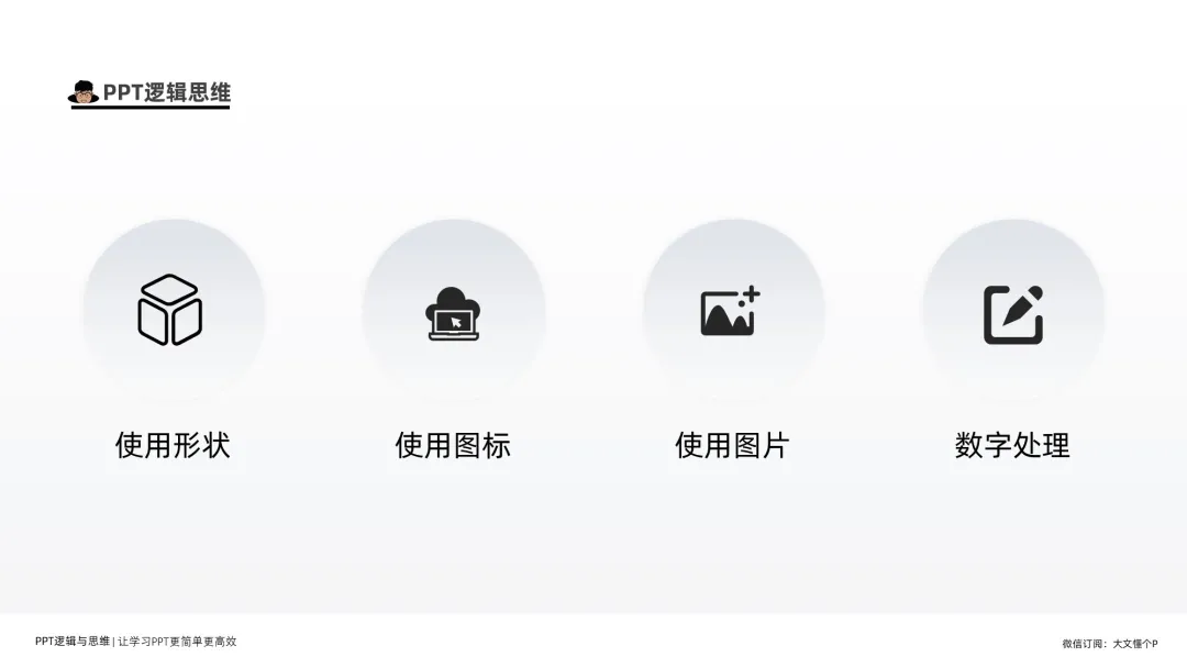 那具体的设计思维有哪些呢?从幻灯片本身出发,无非就是:图片、形状、文字、图标,这几大类。