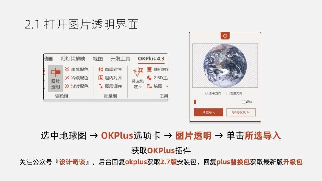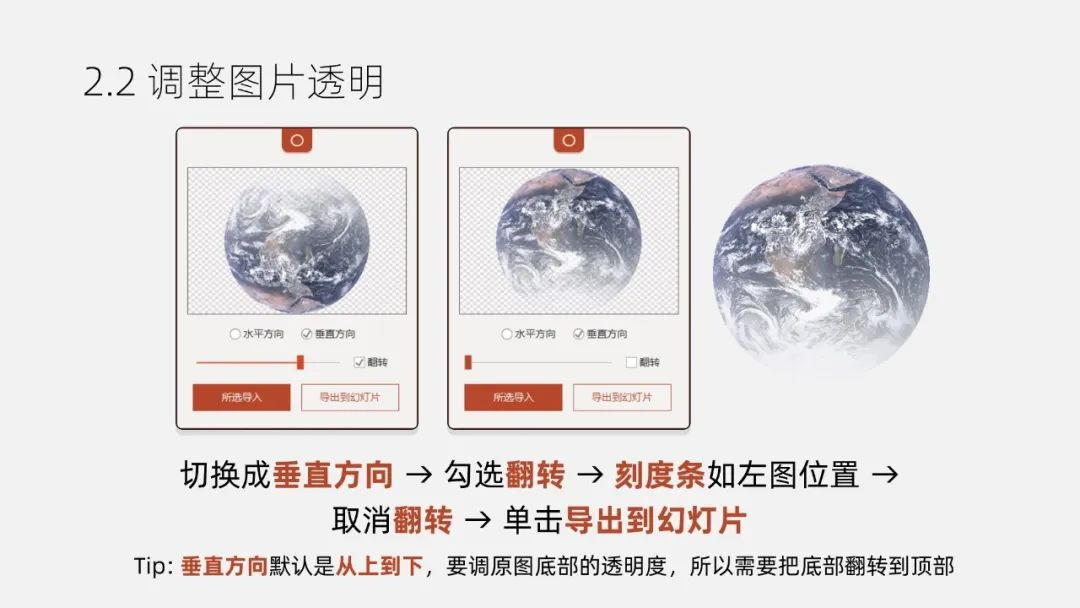 导出到幻灯片Tip1:选择垂直方向后,默认是从上往下透明,所以需要勾选翻转