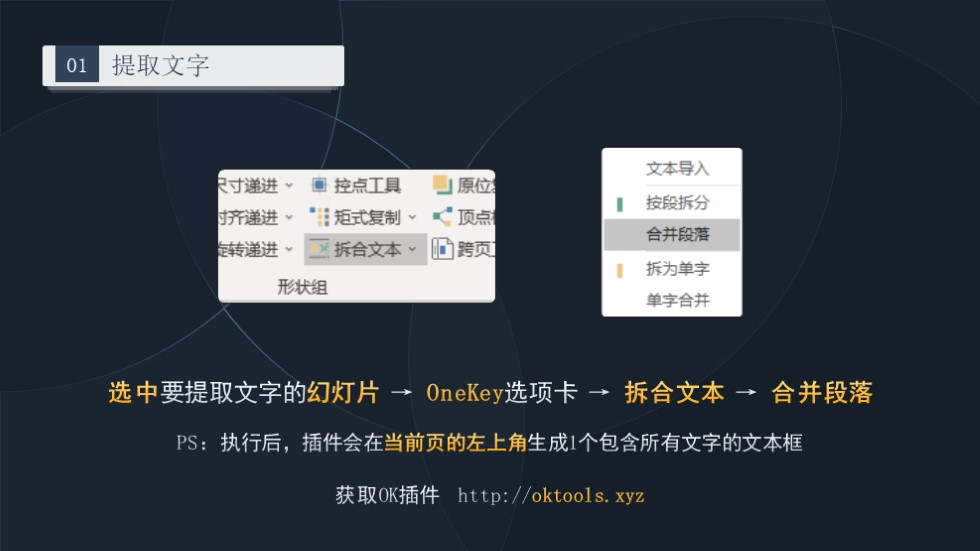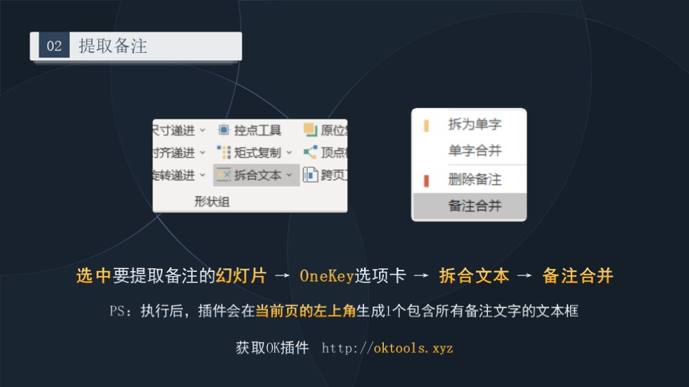 :批量提取幻灯片中的对象:1、提取文字:选中要提取文字的幻灯片 → OneKey选项卡 → 拆合文本 → 合并段落;2、提取备注:选中要提取备注的幻灯片 → OneKey选项卡 → 拆合文本 → 备注合并;3、提取其余对象:在幻灯片末尾新建一张新幻灯片 → 选中图片所在的多张幻灯片 → OneKey选项卡 → 辅助功能 → 多页合并。