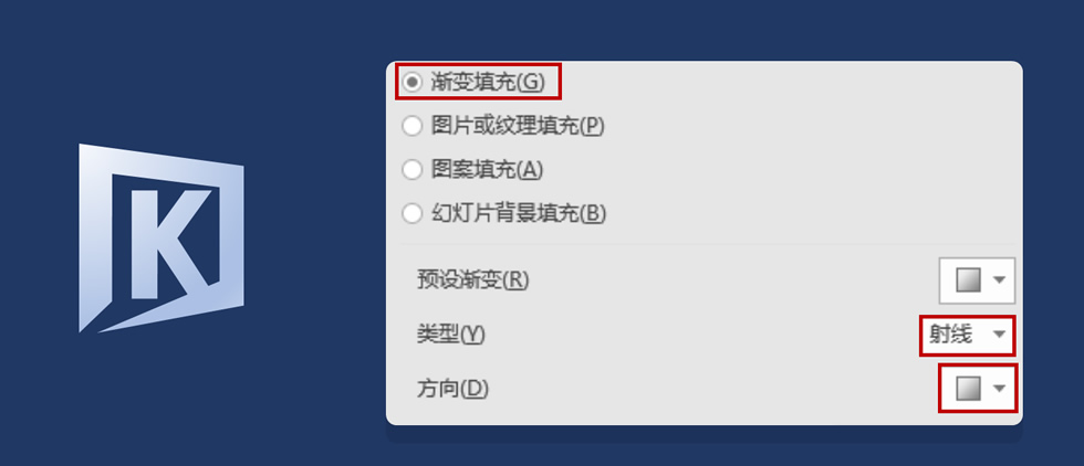 选中1个矢量形状后右键 → 设置形状格式 → 填充 → 渐变填充 →类型:射线 → 方向:从左上角