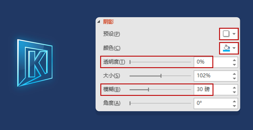 切换到阴影 → 预设:偏移:中 → 颜色:浅蓝 → 透明度:0% → 模糊:30磅 → 完成