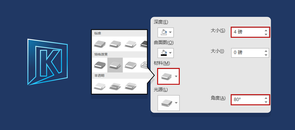 切换到三维格式 → 深度大小:4磅 → 材料:柔边缘 → 角度:80°