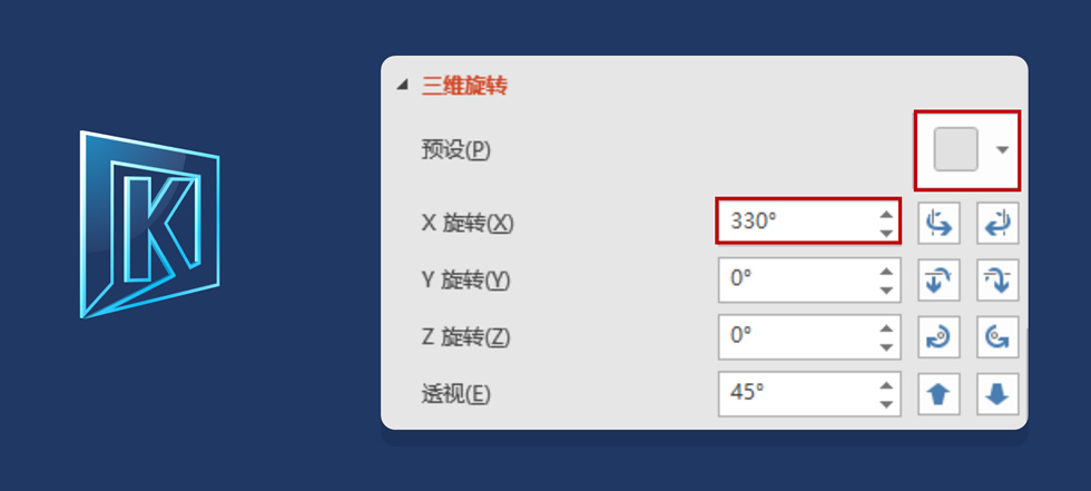 切换到三维旋转 → 预设:透视:前 → X旋转:330°