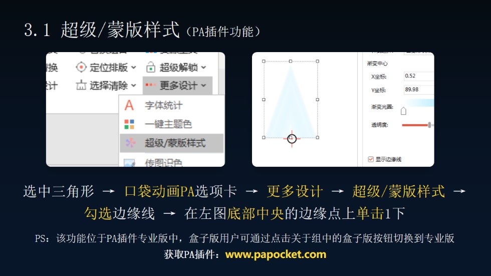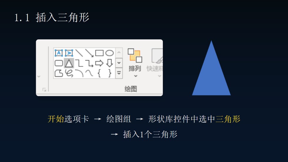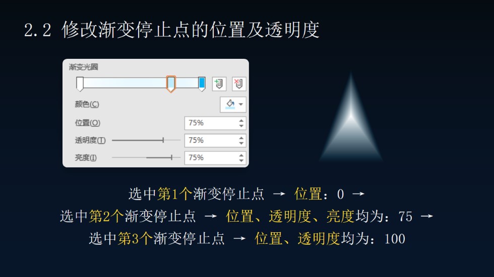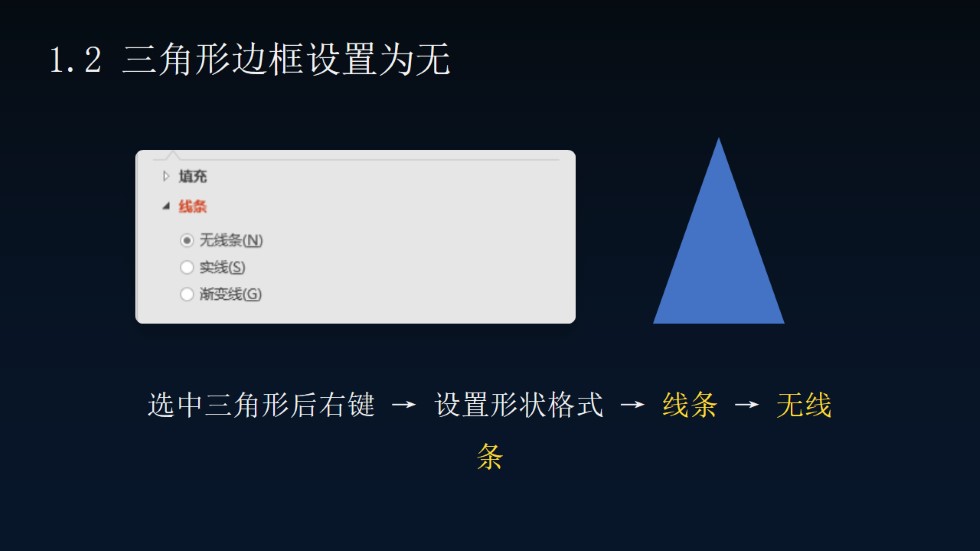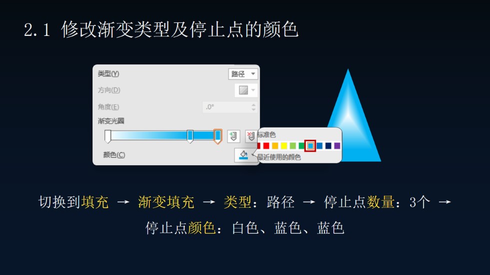 :PPT矢量光束教程:1.1 插入三角形,开始选项卡 → 绘图组 → 形状库控件中选中三角形 → 插入1个三角形;1.2 三角形边框设置为无:选中三角形后右键 → 设置形状格式 → 线条 → 无线条;2.1 修改渐变类型及停止点的颜色:切换到填充 → 渐变填充 → 类型:路径 → 停止点数量:3个 → 停止点颜色:白色、蓝色、蓝色。