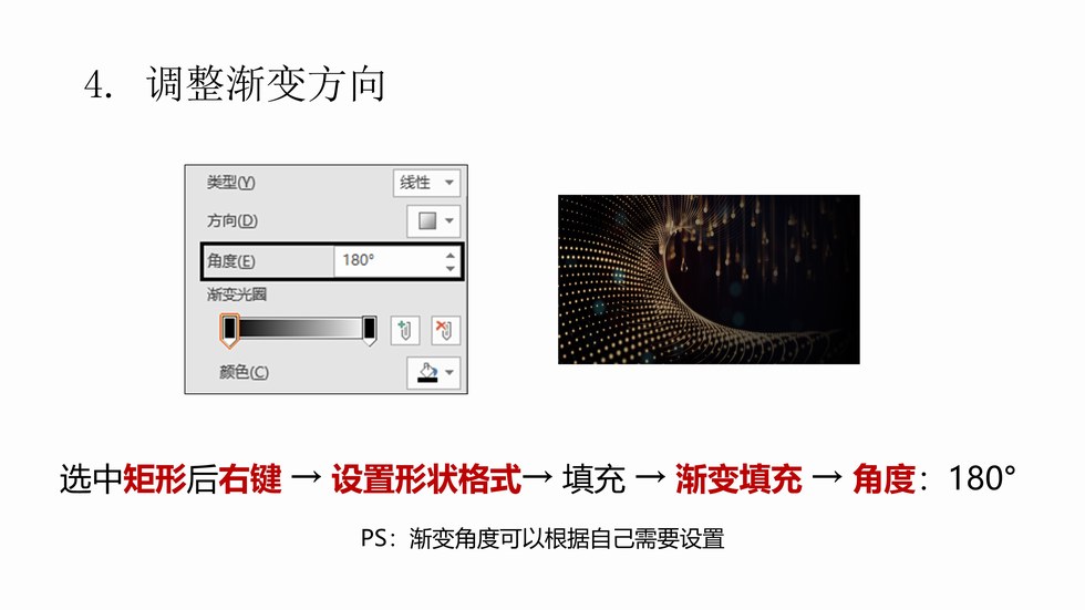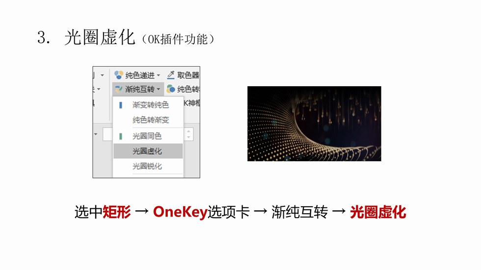 :PPT封面渐变遮罩:1. 全屏大小(OK插件功能);2. 插入形状;3. 光圈虚化;4. 调整渐变方向;5. 加文字后完成。