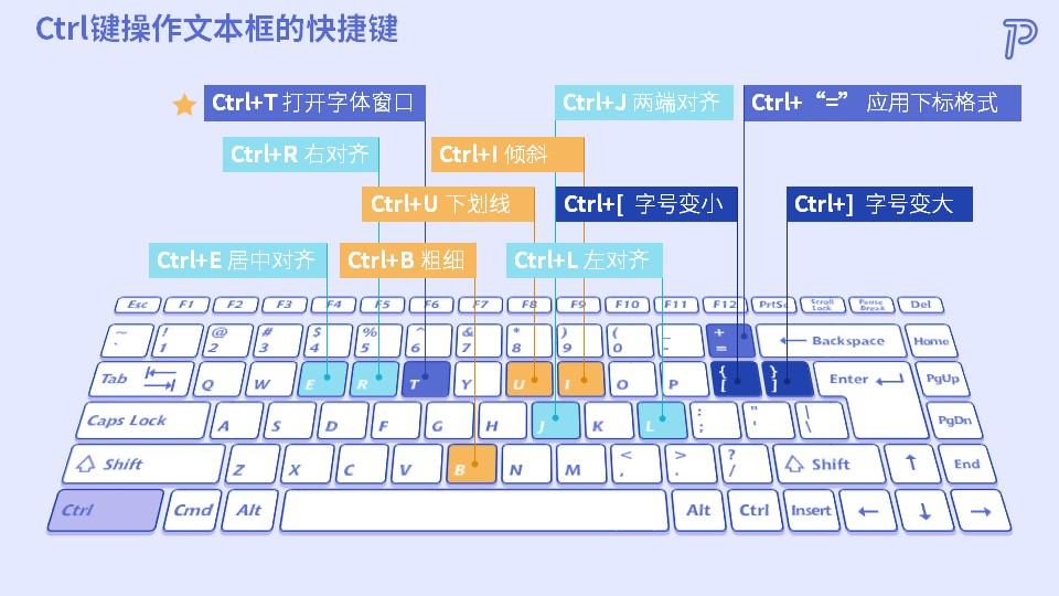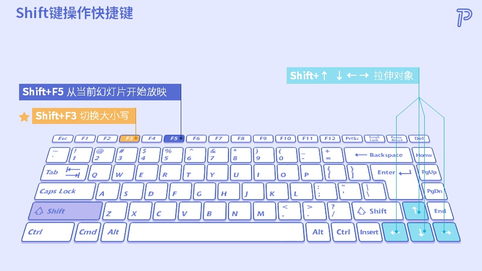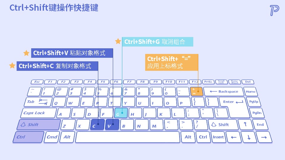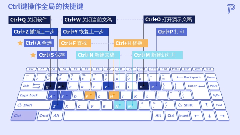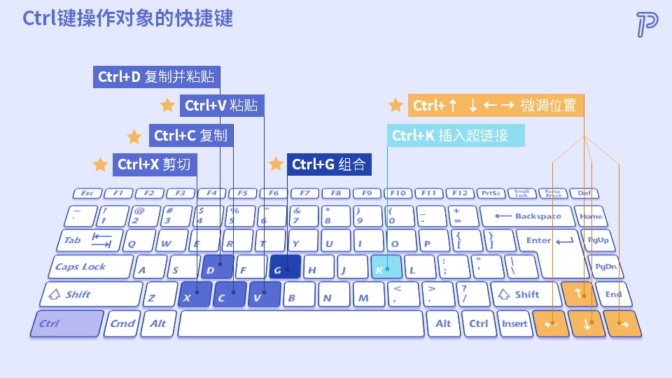:PPT常用快捷键,Ctrl键操作全局的快捷键,Ctrl键操作对象的快捷键,Ctrl键操作文本框的快捷键,Shift键操作快捷键 ,Ctrl+Shift键操作快捷键,Alt键操作快捷键,Ctrl+Alt键操作快捷键,Alt+Shift键操作快捷键,非组合快捷键,放映状态快捷键,配合鼠标运用的快捷操作。