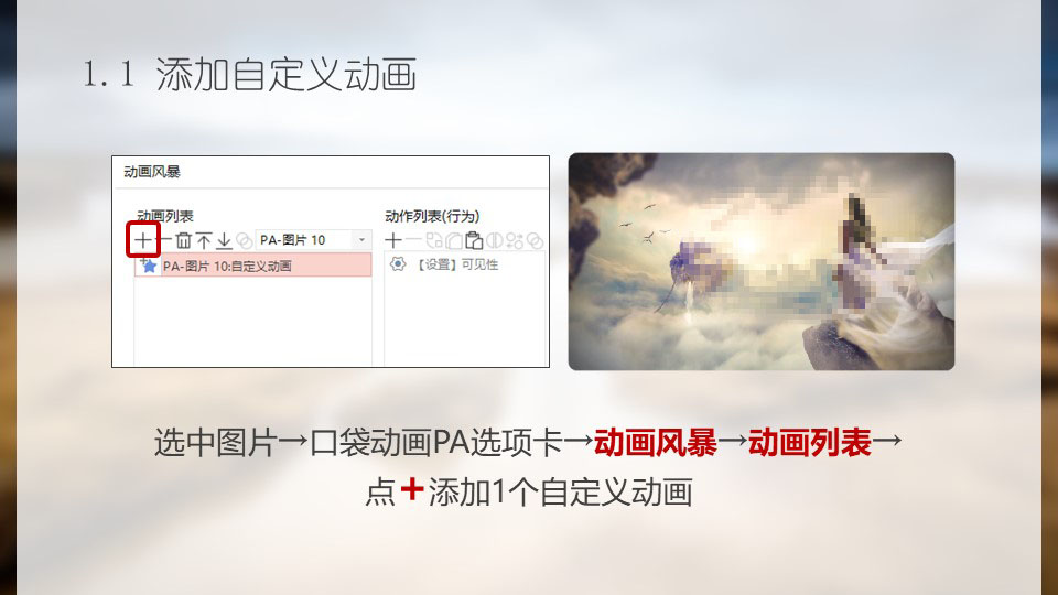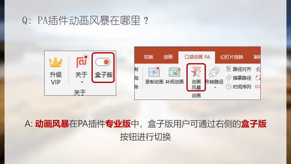 :超简单的PPT翻转淡入动画,Q: PA插件动画风暴在哪里?A: 动画风暴在PA插件专业版中,盒子版用户可通过右侧的盒子版按钮进行切换。0. 准备1个图形;1.1 添加自定义动画;1.2 添加动作;2.1 修改第1个X坐标动作;2.2 修改第2个X坐标动作;2.3 修改滤镜动作;3. 修改持续时间、勾选平滑结束;口袋动画PA选项卡→动画库→搜索“翻转淡入动画”或“只为设计”。