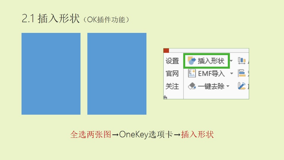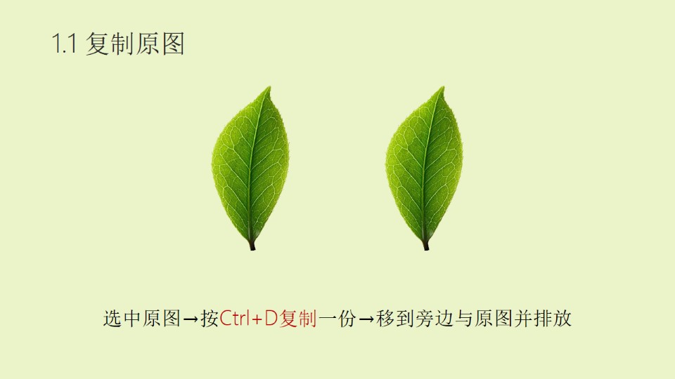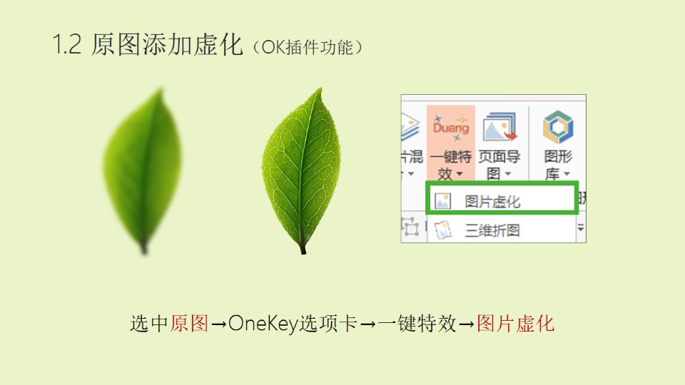 :PPT树叶渐进虚化:0. 准备一张树叶的免抠PNG图片;1.1 复制原图:选中原图→按Ctrl+D复制一份→移到旁边与原图并排放;1.2 原图添加虚化(OK插件功能):选中原图→OneKey选项卡→一键特效→图片虚化;2.1 插入形状;2.2 两个矩形填充改为白色;2.2 两个矩形填充改为白色;3.1 两个矩形进行光圈虚化;3.2 第二个矩形进行光圈逆序;4.1 正片叠底;4.2 删除原图。