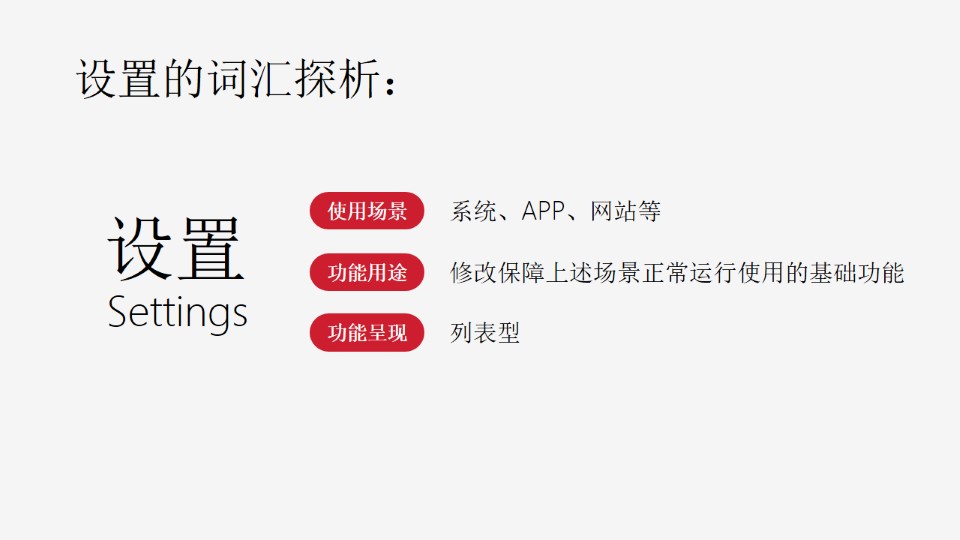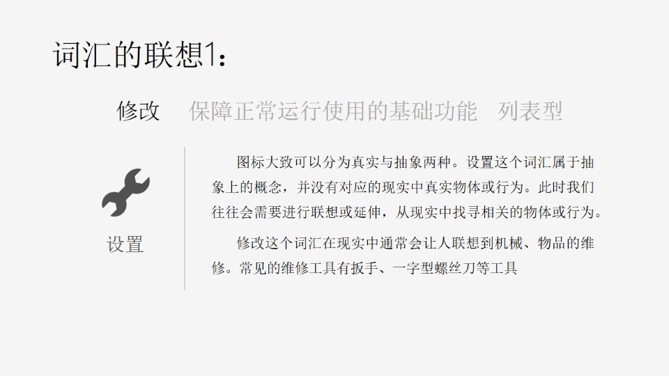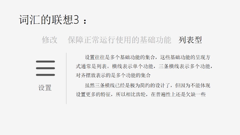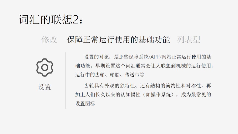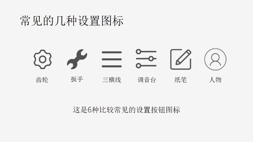 :设置按钮的图标探析:常见的几种设置图标:齿轮、扳手、三横线、调音台、纸笔、人物,这是6种比较常见的设置按钮图标,设置的词汇探析:词汇的联想... ...