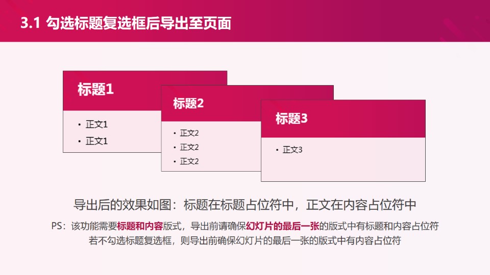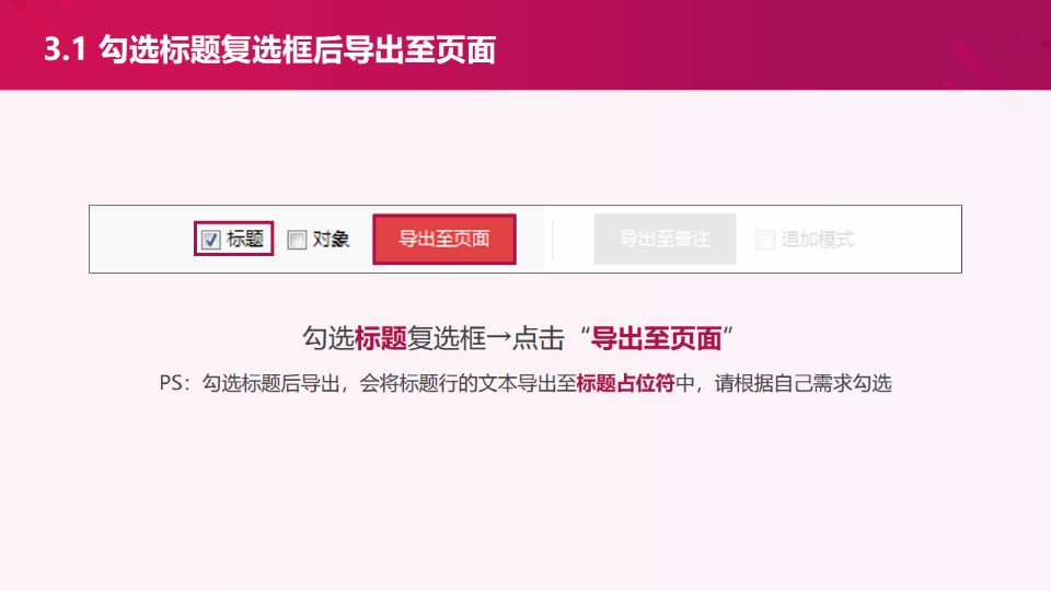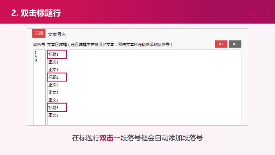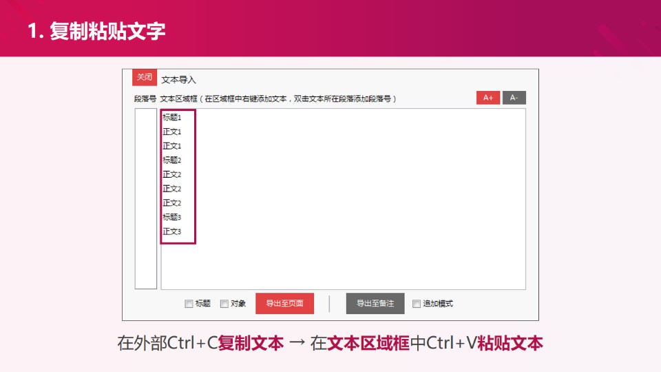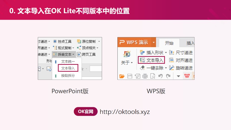 :文本如何快速导入PPT:0. 文本导入在OK Lite不同版本中的位置;1. 复制粘贴文字:在外部Ctrl+C复制文本 → 在文本区域框中Ctrl+V粘贴文本;2. 双击标题行:在标题行双击→段落号框会自动添加段落号;3.1 勾选标题复选框后导出至页面;3.2 选中幻灯片导出至备注。