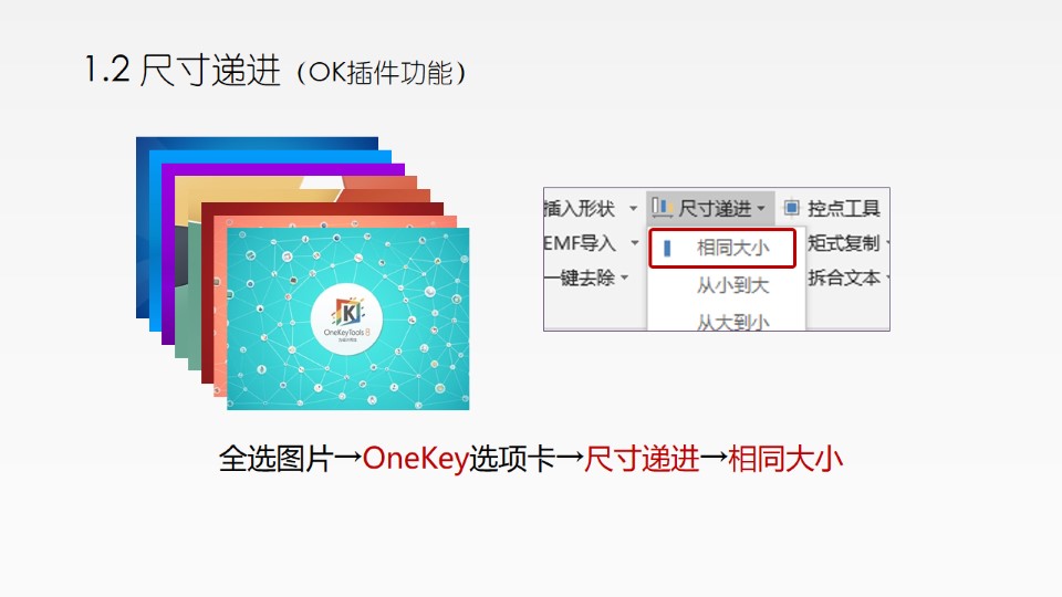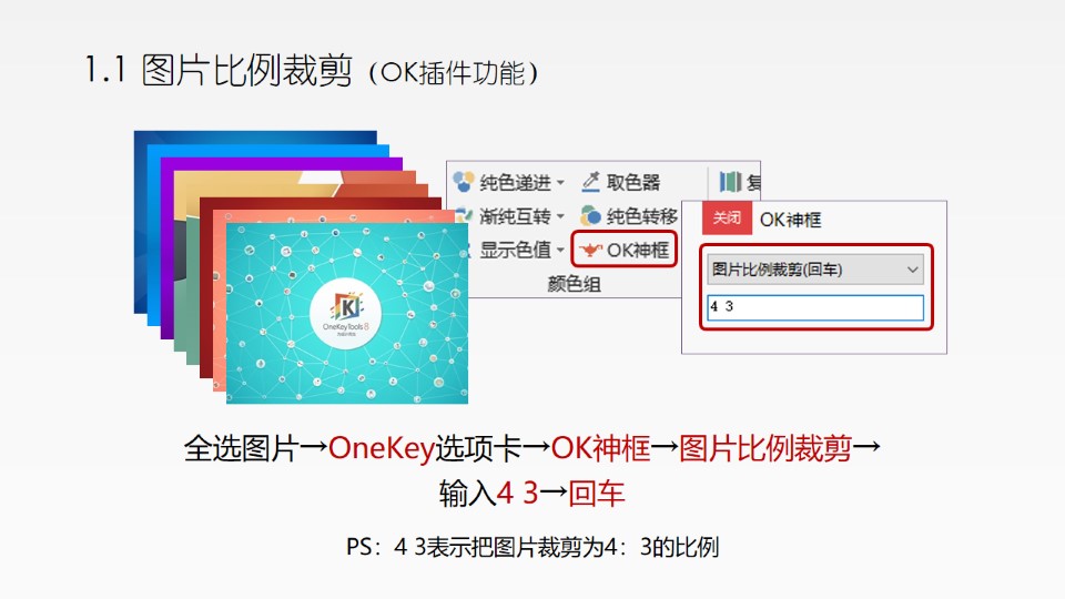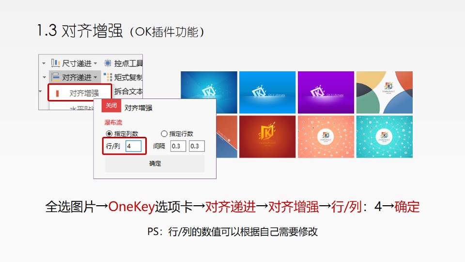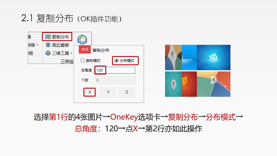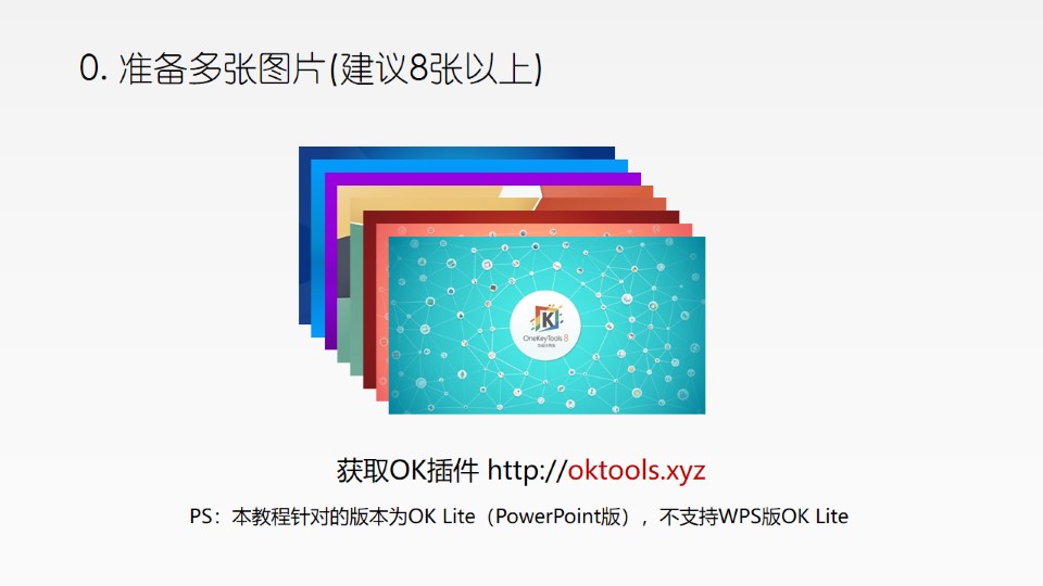 :PPT图片三维:弧形图片墙,0. 准备多张图片(建议8张以上);1.1 图片比例裁剪(OK插件功能);1.2 尺寸递进;1.3 对齐增强;2.1 复制分布;2.2 三维旋转;2.3 距底边高度设置为负值;3.1 批量补位;3.2 添加透视;4. 添加映像。