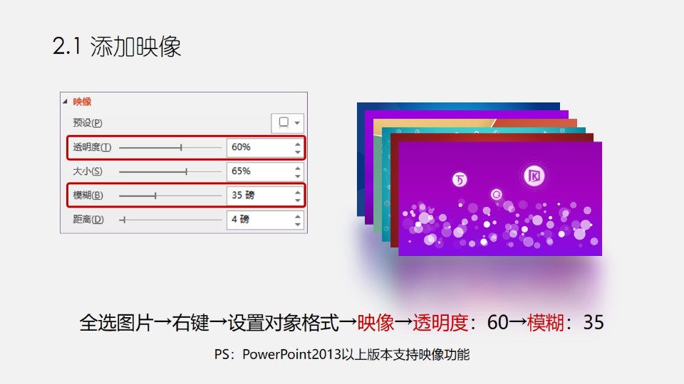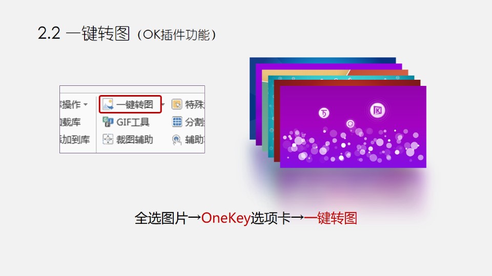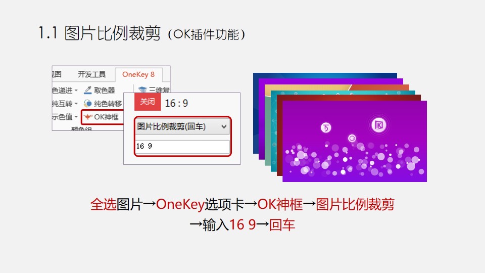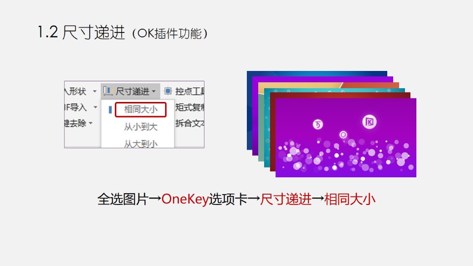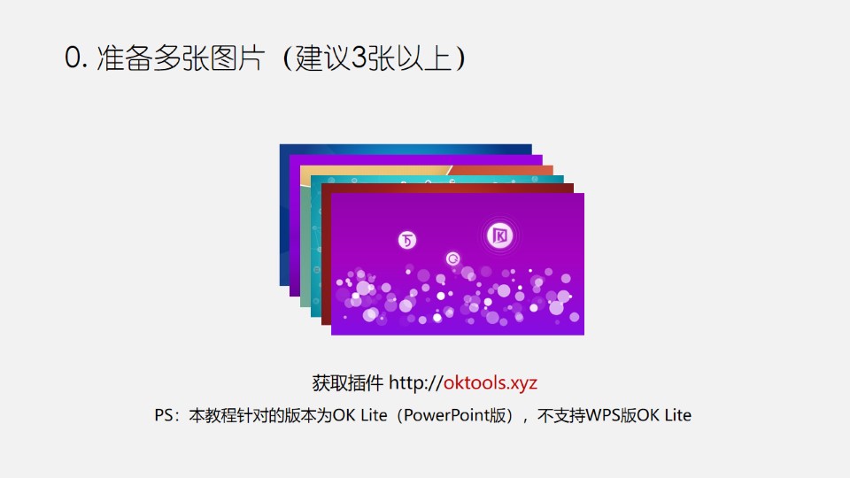 :PPT图片三维:映像图轮;0. 准备多张图片(建议3张以上);1.1 图片比例裁剪(OK插件功能);1.2 尺寸递进;2.1 添加映像;2.2 一键转图;3.1 复制分布;3.2 添加透视;4.1 添加三维旋转;4.2 把暗色图片置于底层。