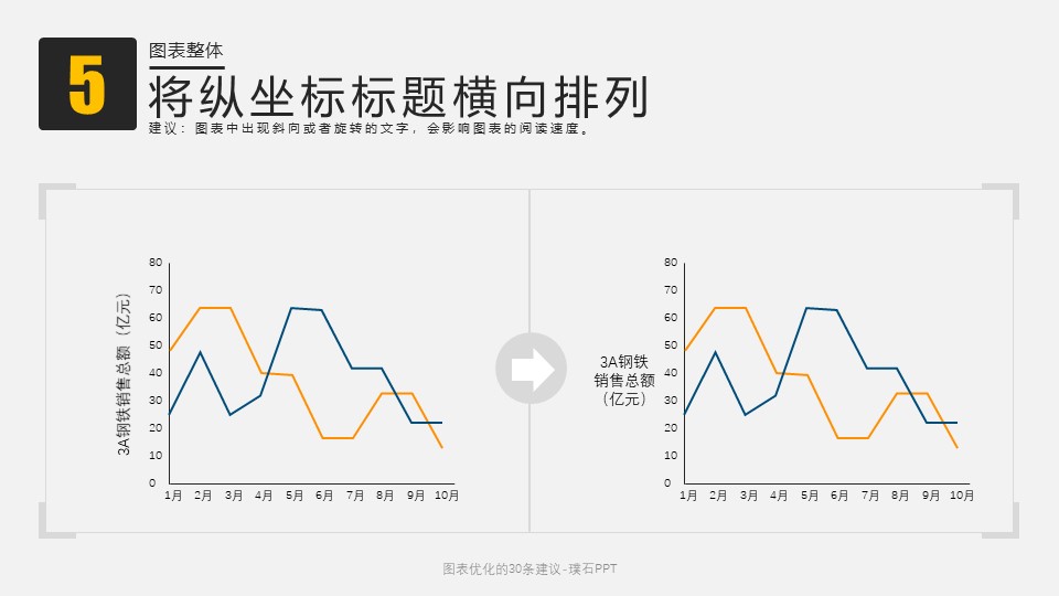 :图表优化的30条建议,1、使用成熟的配色;2、使用辨识度较高的字体;3、设计规整平衡的版式;4、去掉多余的网格线;5、将纵坐标标题横向排列;6、将3D图表改为2D图表;7、删除不需要的数据表;8、删除不需要的纵坐标轴;9、把图表重点写进标题里;10、把图表重点强调出来。