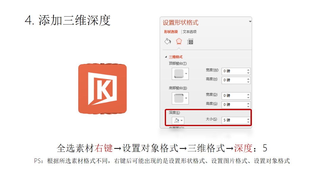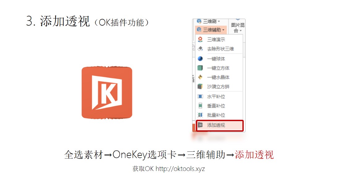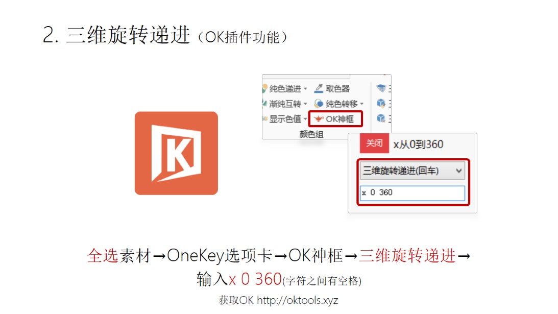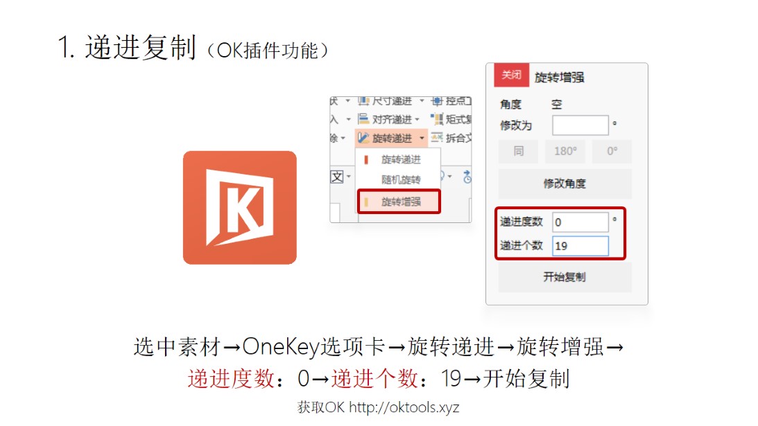 :PPT三维旋转GIF动画制作,0. 准备一个素材;1. 递进复制(OK插件功能);2. 三维旋转递进;3. 添加透视;4. 添加三维深度;5. GIF合并(OK插件功能)。
