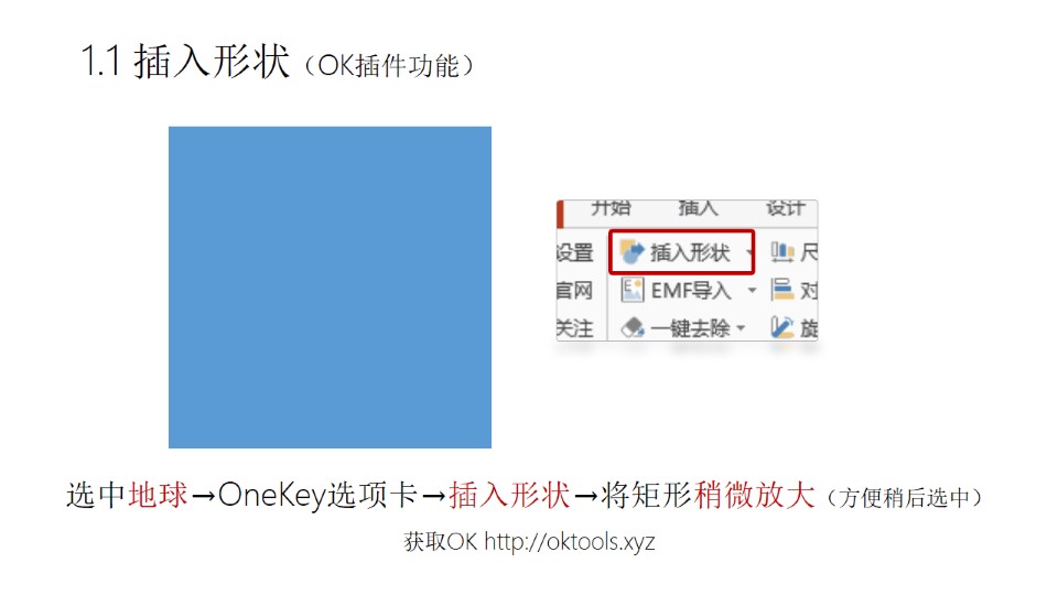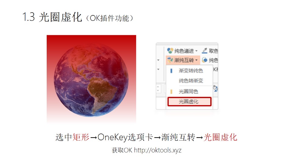 :PPT图片融合(三):0. 准备PNG素材;1.1 插入形状(OK插件功能)、1.2 矩形填充白色、1.3 光圈虚化;2.1 开启OK图片混合彩蛋、2.2 矩形置于底层、2.3 原位复制;3.1 色调置换、3.2 调整图片亮度。