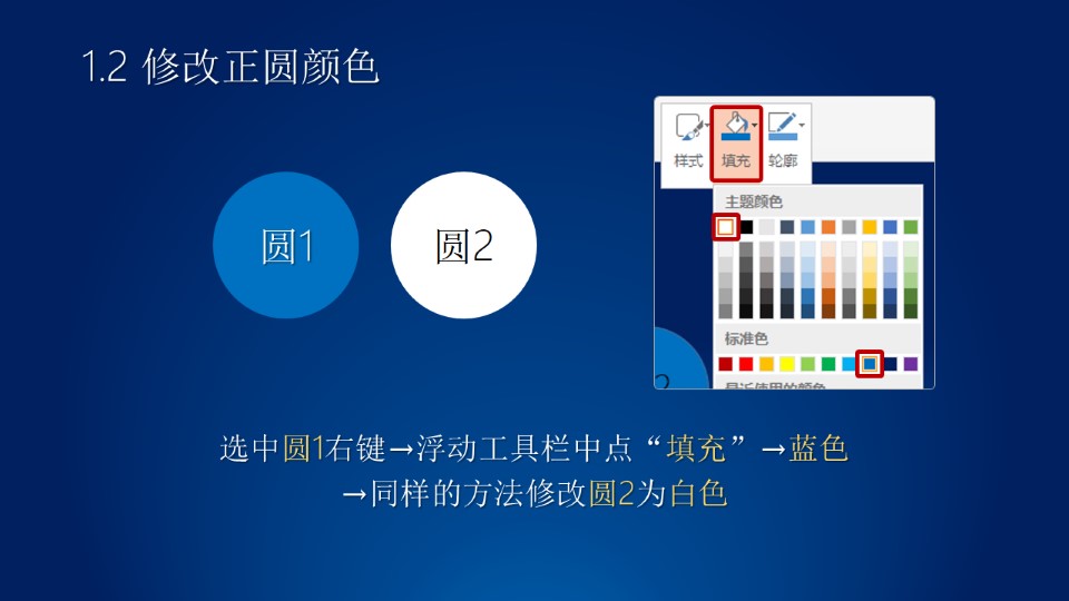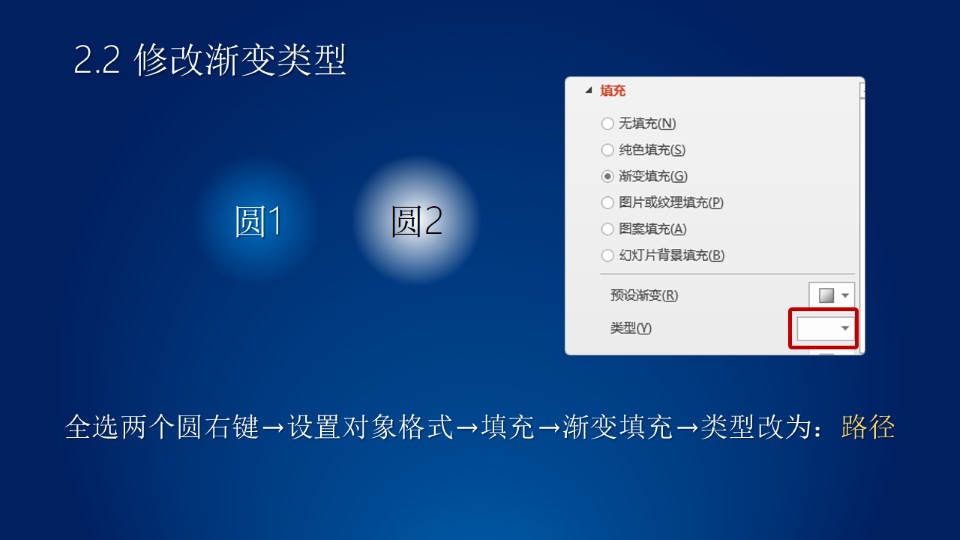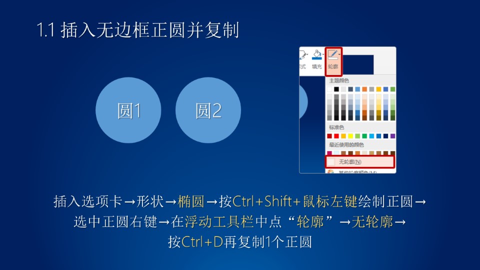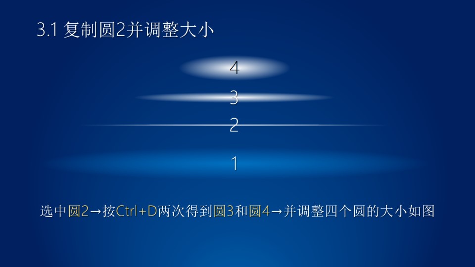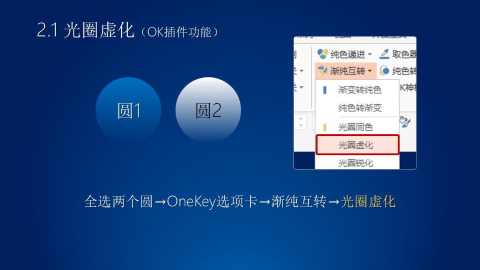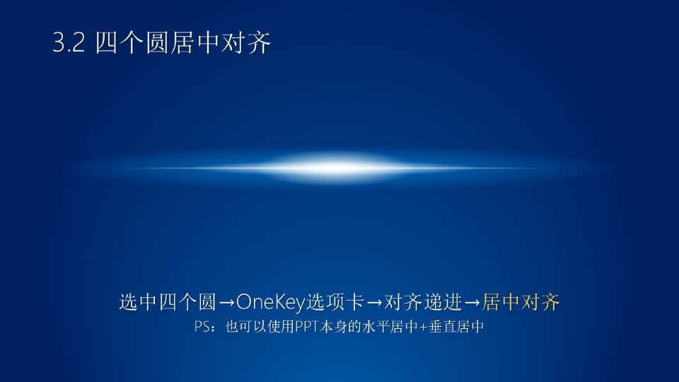 :PPT制作光芒,1.1 插入无边框正圆并复制:插入选项卡→形状→椭圆→按Ctrl+Shift+鼠标左键绘制正圆→选中正圆右键→在浮动工具栏中点“轮廓”→无轮廓→按Ctrl+D再复制1个正圆;1.2 修改正圆颜色:选中圆1右键→浮动工具栏中点“填充”→蓝色→同样的方法修改圆2为白色;2.1 光圈虚化(OK插件功能);2.2 修改渐变类型;3.1 复制圆2并调整大小;3.2 四个圆居中对齐;3.2 柔化边缘(只为设计的独家秘方)。