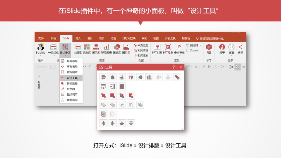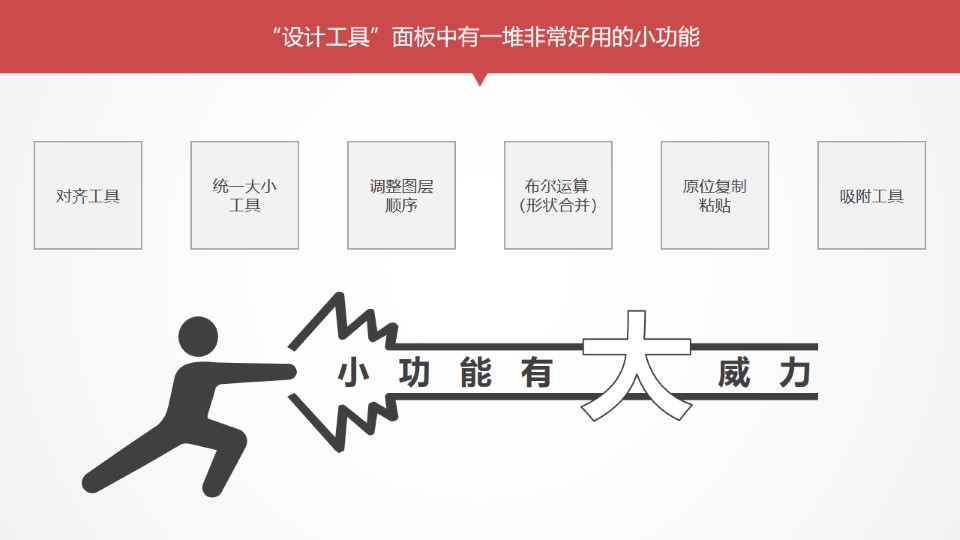 :小面板,大威力,iSlide插件设计排版之设计工具,在iSlide插件中,有一个神奇的小面板,叫做“设计工具”,“设计工具”面板中有一堆非常好用的小功能,第一组:对齐工具;第二组:统一大小工具;第三组:调整图层顺序工具; 第四组:布尔运算(形状合并);第五组:原位复制粘贴;第六组:吸附工具;打开设计工具面板,准备起飞!