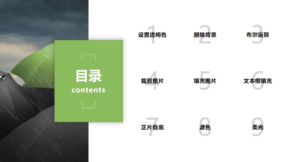 :PPT最强抠图技法,目录:设置透明色,删除背景,布尔运算,裁剪图片,填充图片,文本框填充,正片叠底,滤色,柔光9种方式解读使用PowerPoint抠图的实用技巧。