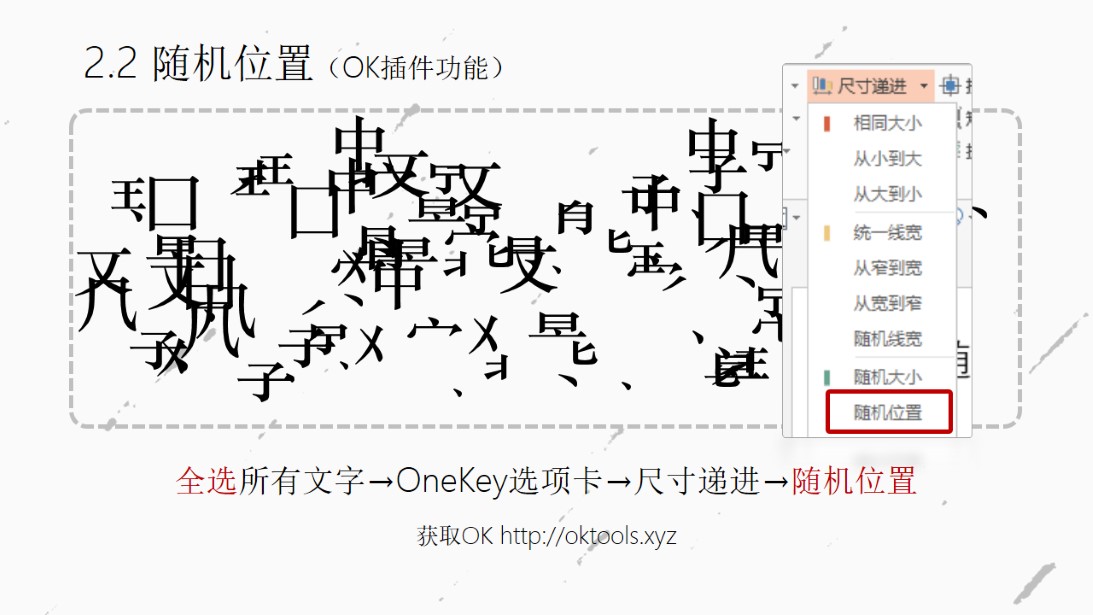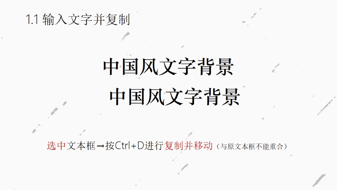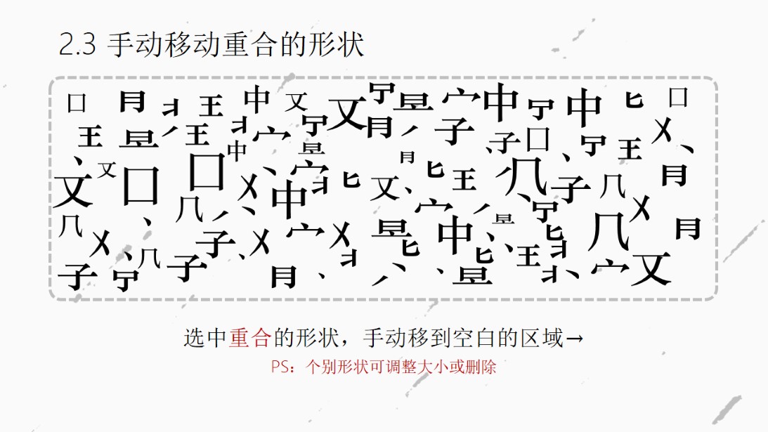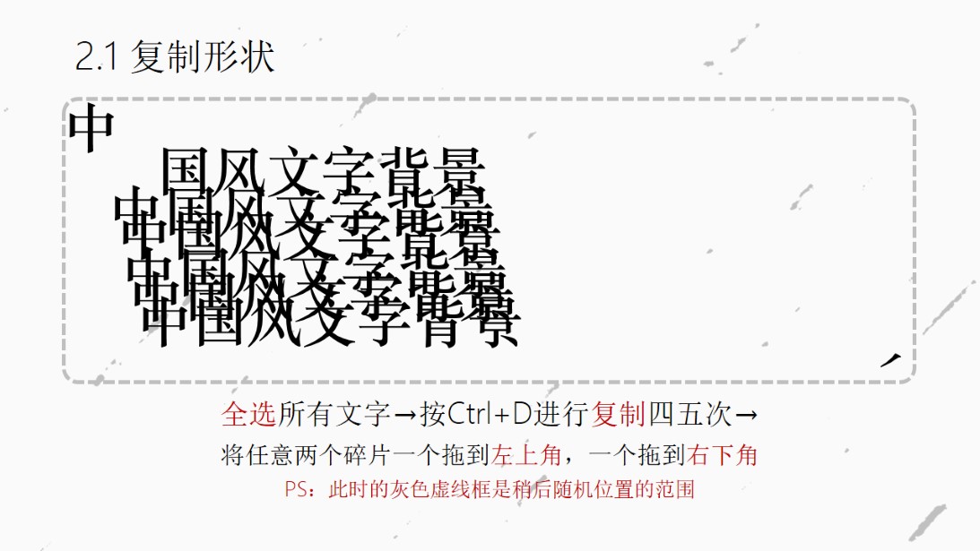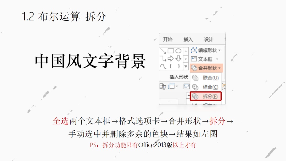 :PPT中国风文字背景,1.1 输入文字并复制 :选中文本框→按Ctrl+D进行复制并移动(与原文本框不能重合);1.2 布尔运算-拆分:全选两个文本框→格式选项卡→合并形状→拆分→手动选中并删除多余的色块→结果如左图。PS:拆分功能只有Office2013版以上才有;2.1 复制形状:全选所有文字→按Ctrl+D进行复制四五次→将任意两个碎片一个拖到左上角,一个拖到右下角。PS:此时的灰色虚线框是稍后随机位置的范围... ...