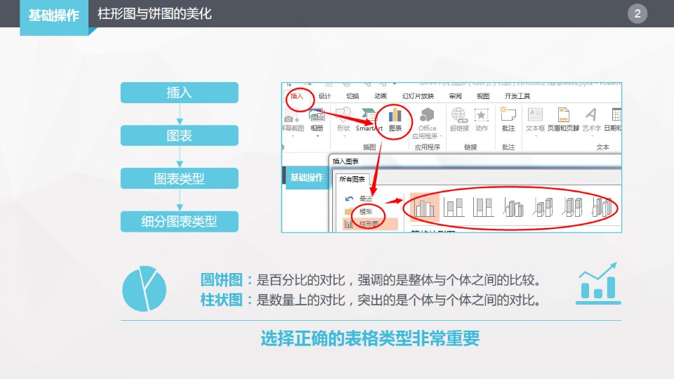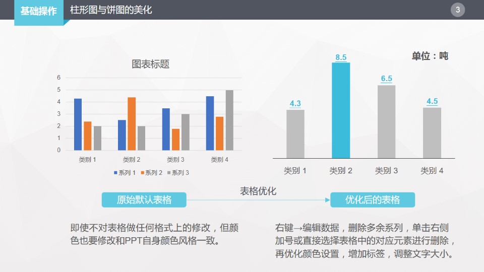 :柱形图与饼图的美化:圆饼图:是百分比的对比,强调的是整体与个体之间的比较。柱状图:是数量上的对比,突出的是个体与个体之间的对比。选择正确的表格类型非常重要。即使不对表格做任何格式上的修改,但颜色也要修改和PPT自身颜色风格一致。右键→编辑数据,删除多余系列,单击右侧加号或直接选择表格中的对应元素进行删除,再优化颜色设置,增加标签,调整文字大小。