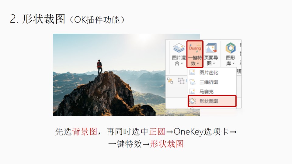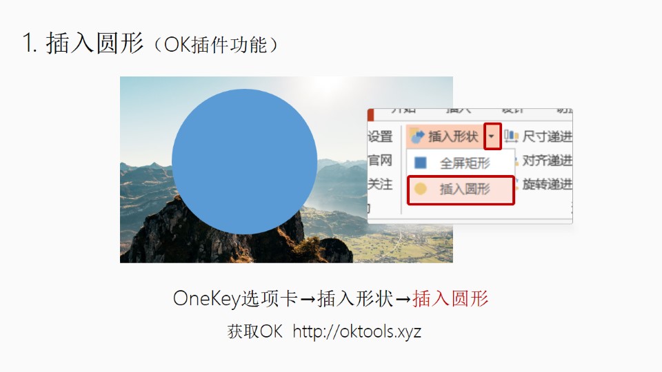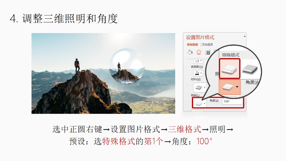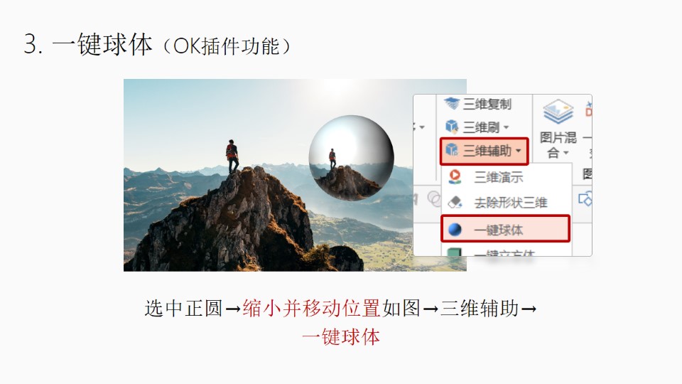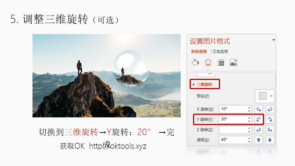 :PPT三维玻璃球,准备:插入图片,1. 插入圆形(OK插件功能);2. 形状裁图(OK插件功能);3. 一键球体(OK插件功能);4. 调整三维照明和角度;5. 调整三维旋转(可选),切换到三维旋转→Y旋转:20° →完成。