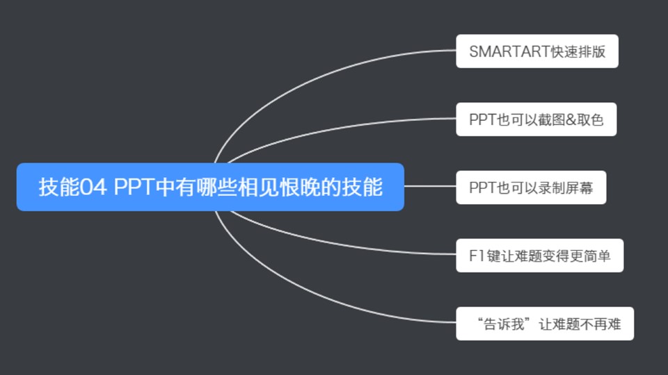 : PPT中有哪些相见恨晚的技巧04,由于技巧太多,所以我会五期完成,总共25个相见恨晚的技巧。如果有启发,请让更多的人知晓,技能16:SMARTART快速排版;技能17:PPT也可以截图&取色;技能18:PPT也可以录制屏幕;技能19:F1键让难题变得更简单;技能20:“告诉我”让难题不再难。