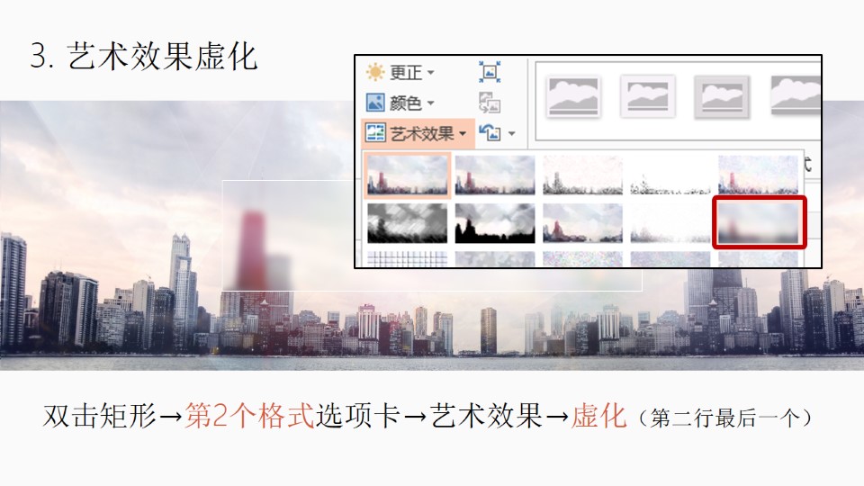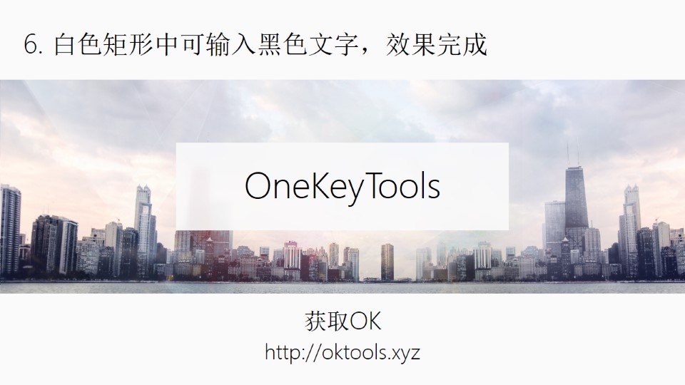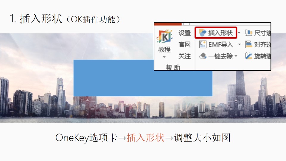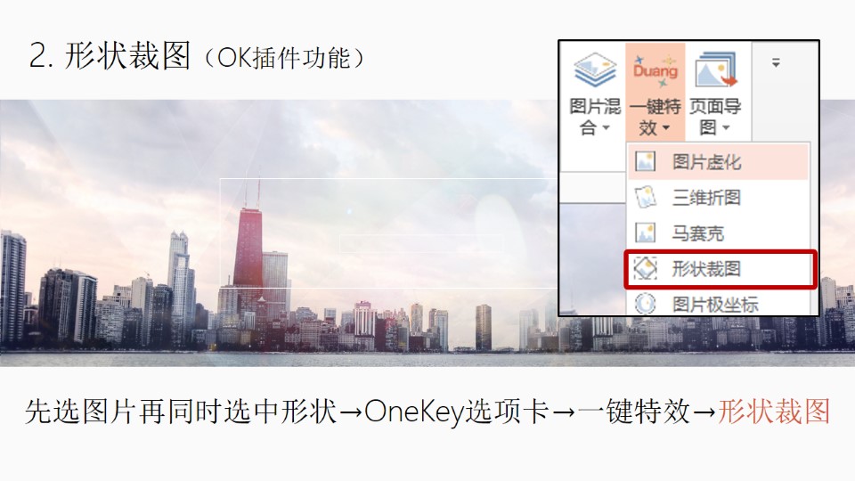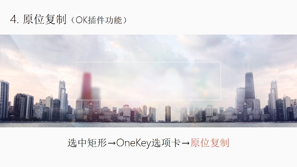 :PPT磨砂玻璃:1. 插入形状(OK插件功能):OneKey选项卡→插入形状→调整大小如图;2. 形状裁图:先选图片再同时选中形状→OneKey选项卡→一键特效→形状裁图;3. 艺术效果虚化:双击矩形→第2个格式选项卡→艺术效果→虚化(第二行最后一个);4. 原位复制:选中矩形→OneKey选项卡→原位复制;5. 修改填充、颜色、透明度:选中矩形右键→设置形状格式→填充改为:纯色填充→颜色:白色→透明度:10%(视情况而定,别太暗或太白就行)。