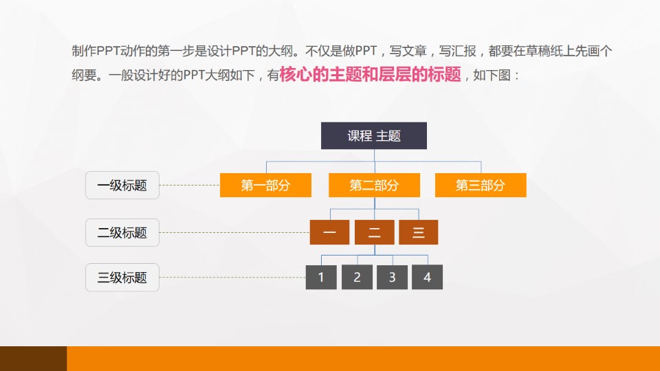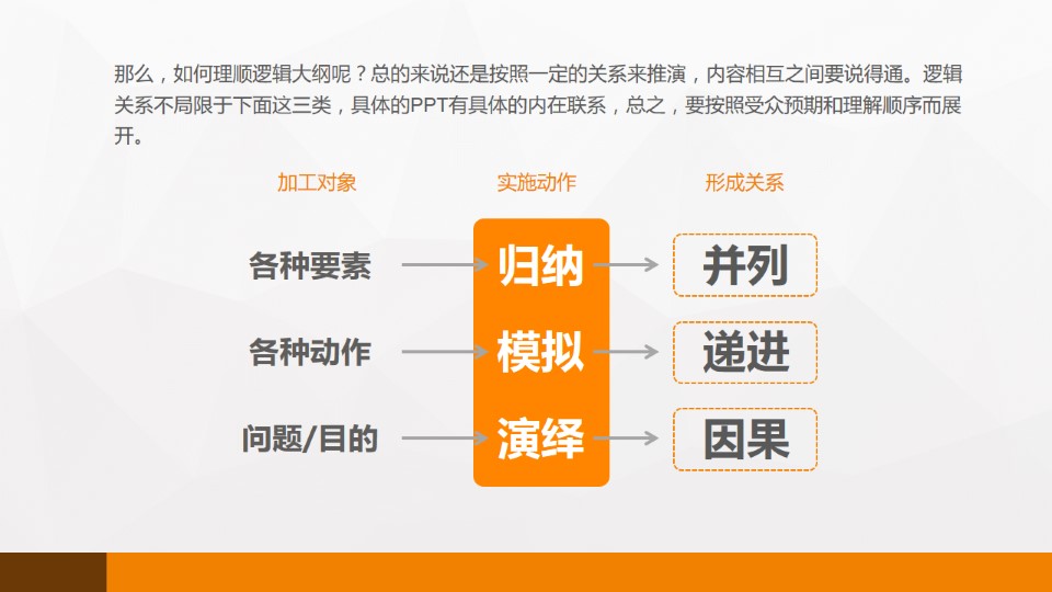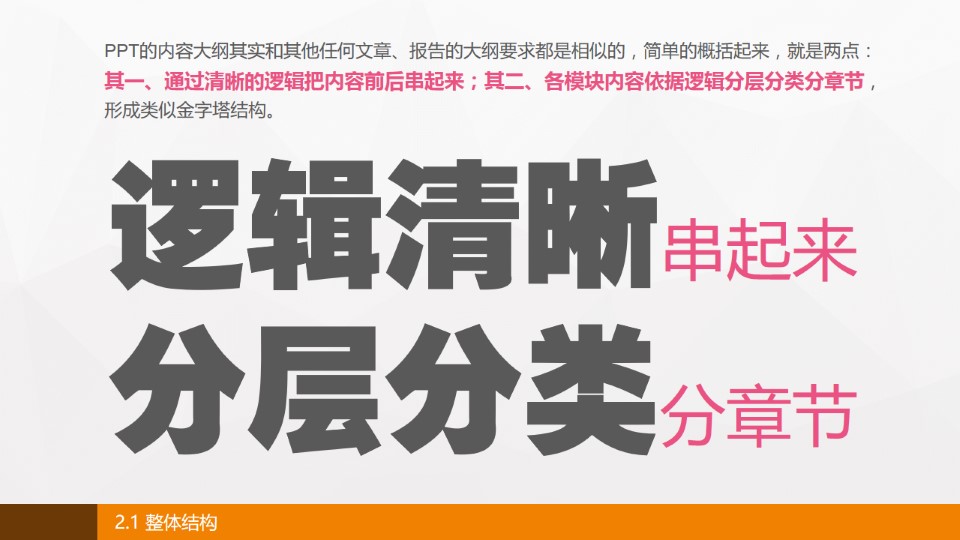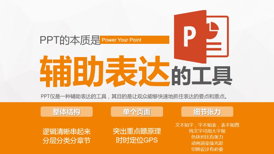:PPT该如何促进表达,PPT的本质是辅助表达的工具,PPT仅是一种辅助表达的工具,其目的是让观众能够快速地抓住表达的要点和重点。整体结构:逻辑清晰串起来分层分类分章节;单个页面:突出重点瞟原理时时定位GPS;细节张力:文不如字,字不如表,表不如图,纯文字可用大字报,色块对比有张力,动画渲染添光彩,切换设计有必要。