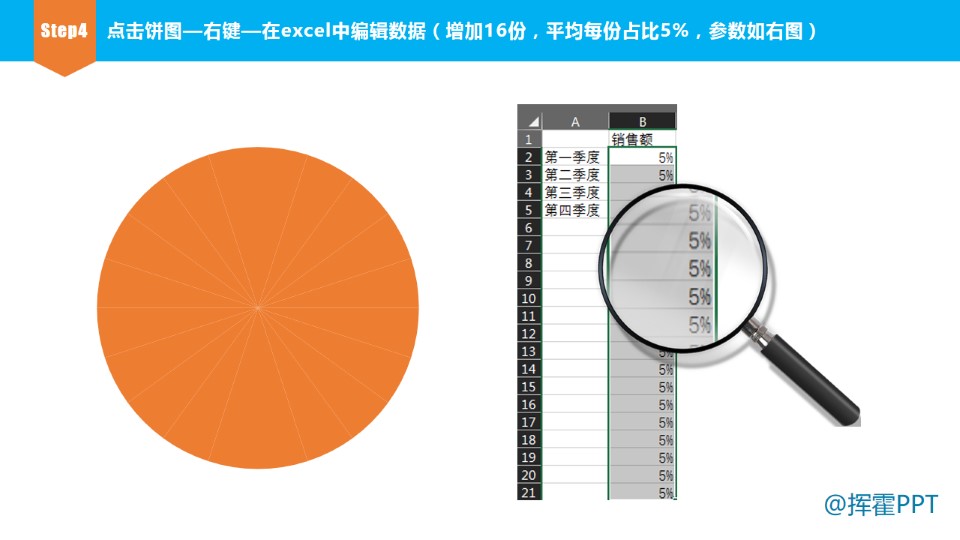 导读:饼图还可以这样玩,饼形图原来还可以用来制作放射状图形:1、插入一个饼形图;2、把标题和图例删除;3、点击饼形图任意一个饼形,把填充颜色改成橙色,无轮廓(点击一次是选中所有饼图);4、点击饼图—右键—在excel中编辑数据(增加16份,平均每份占比5%,参数如右图);5、双击任意一份饼图,填充颜色为浅橙色,利用F4键重复上一次操作,快速完成填充;6、点击选中整个饼图,ctrl加x减除-右键-黏贴为图片;7、然后我们把这一张图片按时ctrl和shift键中心同比例放大至全屏(超出幻灯片屏幕);8、利用裁剪功能把超出幻灯片的部分进行裁剪掉;9、最终效果如下图(有人说,step5就已经能够看出大致效果了,为什么还要继续往后面做?)