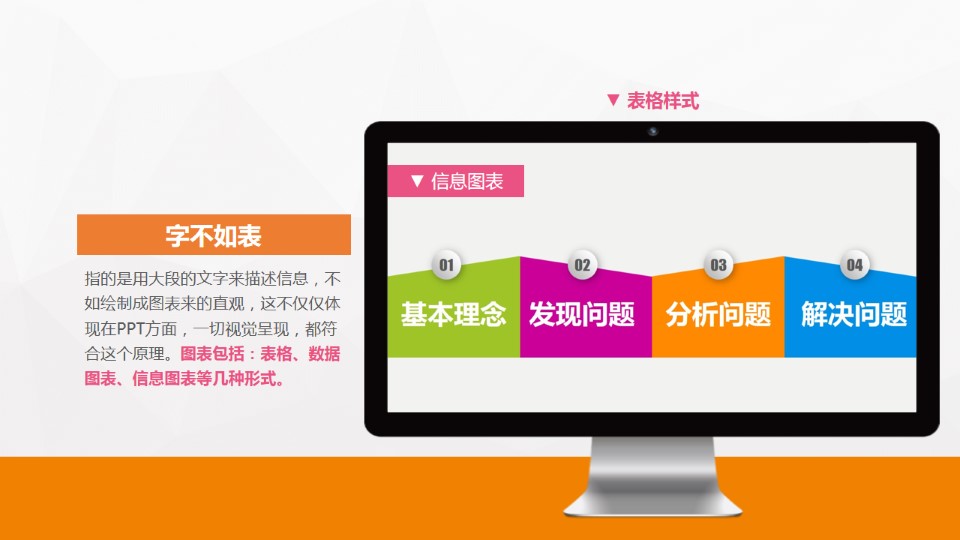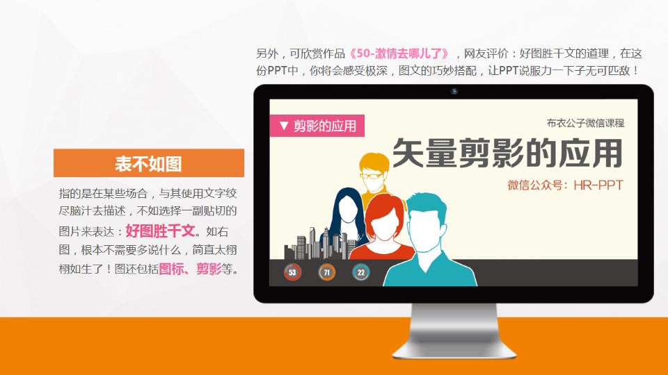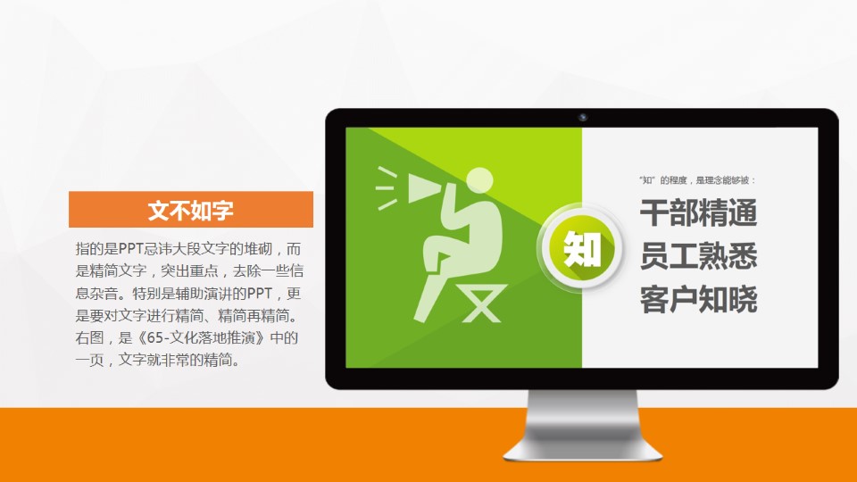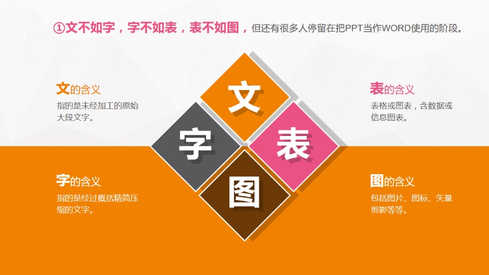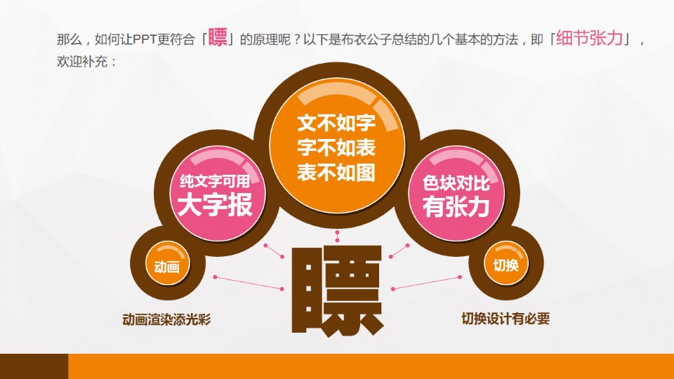 :支撑瞟字之细节张力:那么,如何让PPT更符合「瞟」的原理呢?以下是布衣公子总结的几个基本的方法,即「细节张力」,欢迎补充:动画;纯文字可用大字报;文不如字,字不如表,表不如图;色块对比有张力;切换。①文不如字,字不如表,表不如图,但还有很多人停留在把PPT当作WORD使用的阶段。