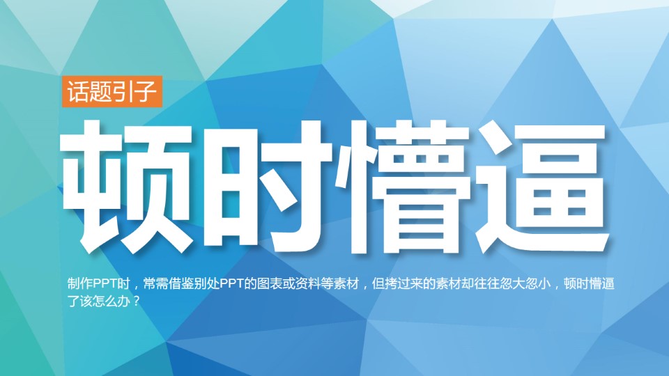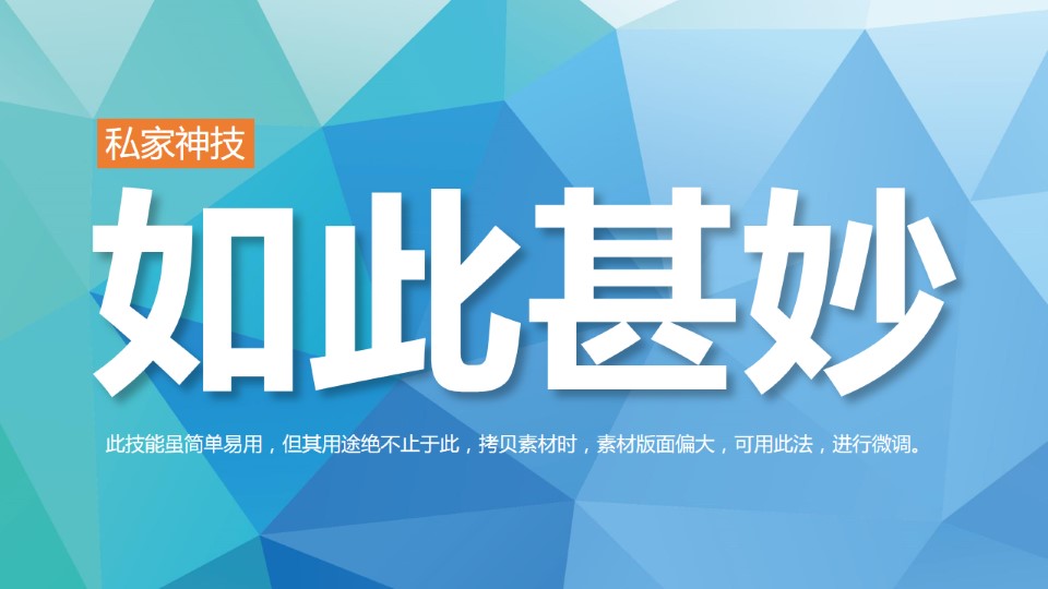 :制作PPT时,常需借鉴别处PPT的图表或资料等素材,但拷过来的素材却往往忽大忽小,顿时懵逼了该怎么办?为什么不同模板内容复制后,会变成这样?私家神技,如此甚妙,此技能虽简单易用,但其用途绝不止于此,拷贝素材时,素材版面偏大,可用此法,进行微调。