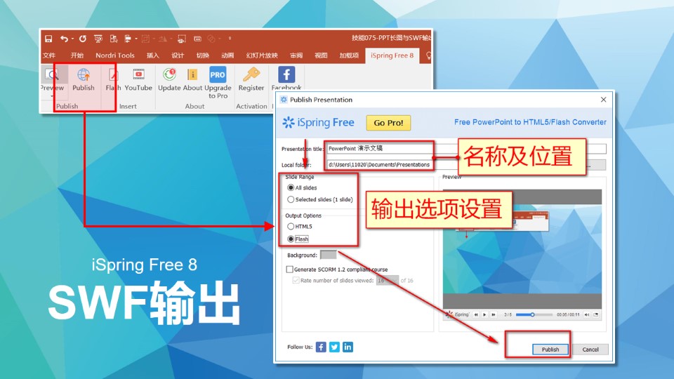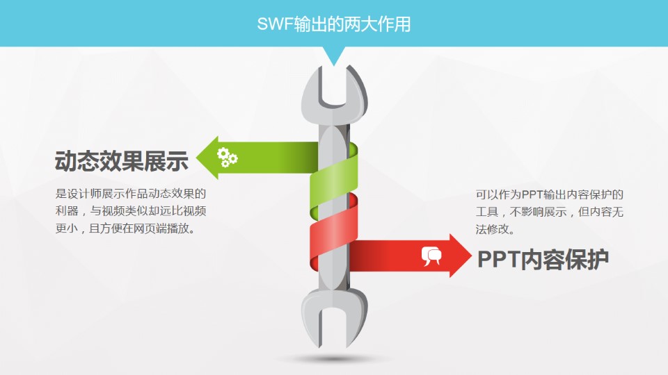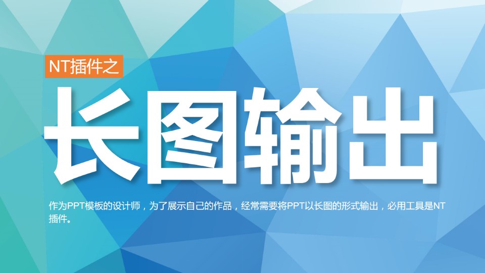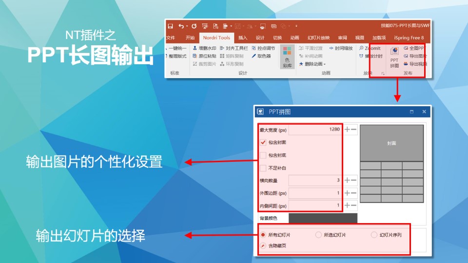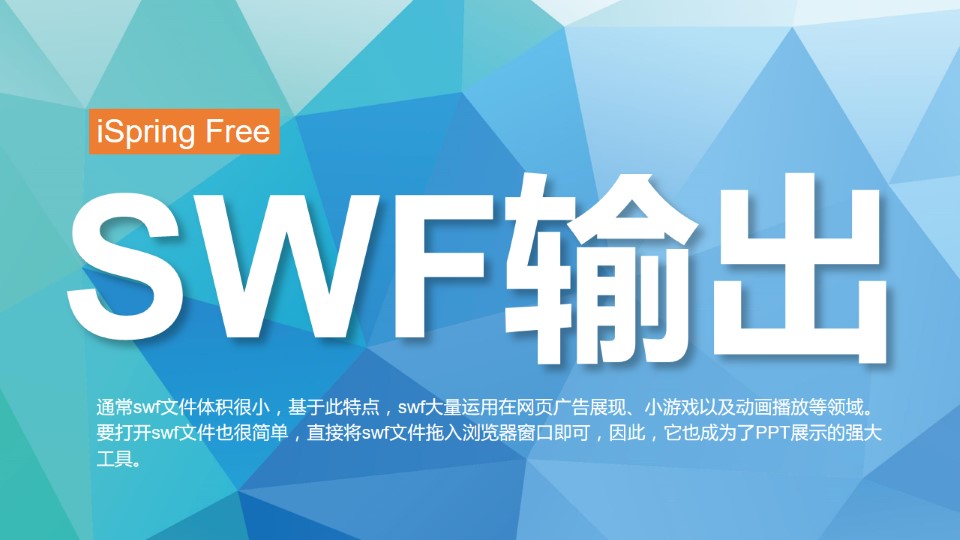 :PPT长图与SWF输出,NT插件之长图输出:作为PPT模板的设计师,为了展示自己的作品,经常需要将PPT以长图的形式输出,必用工具是NT插件。iSpring FreeSWF输出:通常swf文件体积很小,基于此特点,swf大量运用在网页广告展现、小游戏以及动画播放等领域。要打开swf文件也很简单,直接将swf文件拖入浏览器窗口即可,因此,它也成为了PPT展示的强大工具。
