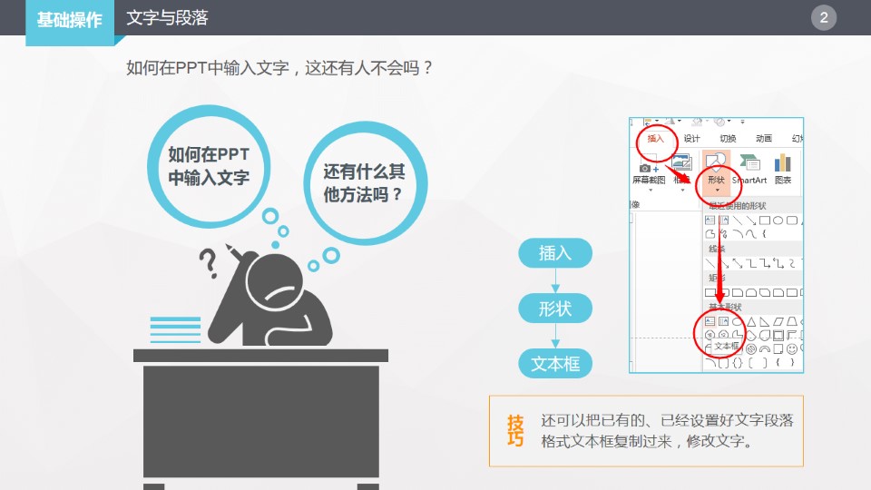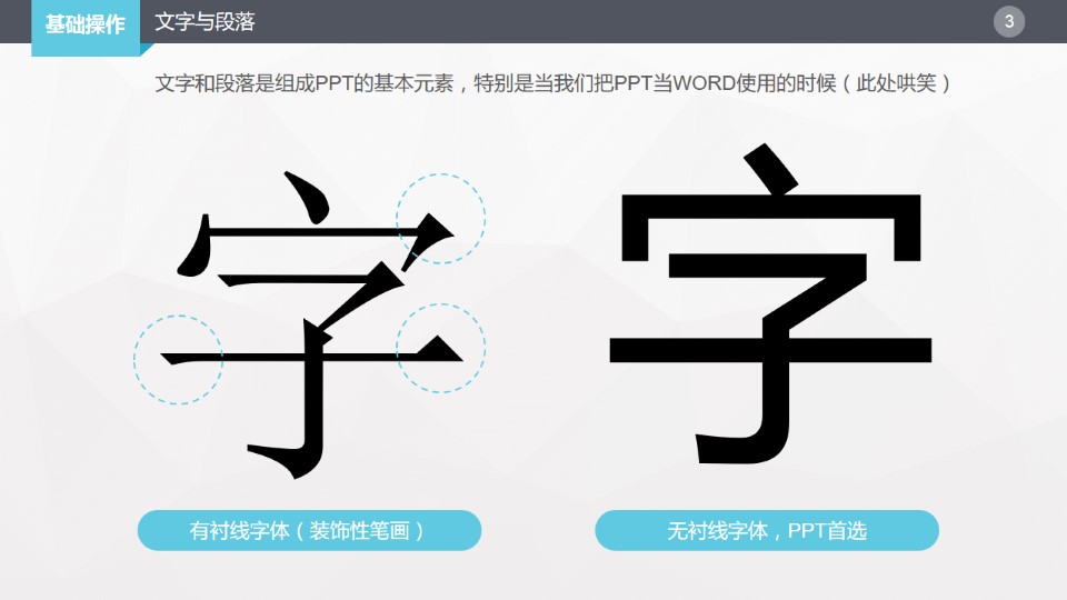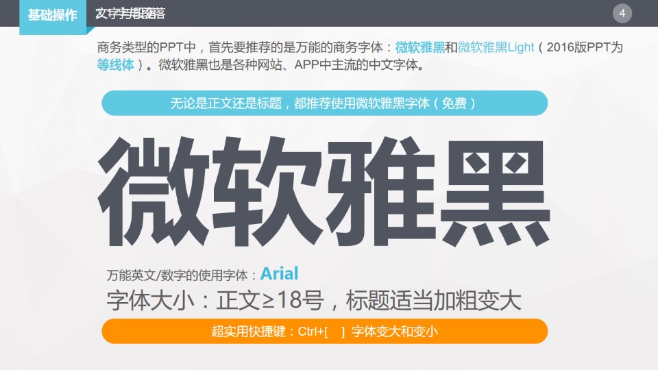 :PPT基础操作之文字与段落:如何在PPT中输入文字,这还有人不会吗?文字和段落是组成PPT的基本元素,特别是当我们把PPT当WORD使用的时候(此处哄笑)商务类型的PPT中,首先要推荐的是万能的商务字体:微软雅黑和微软雅黑Light(2016版PPT为等线体)。微软雅黑也是各种网站、APP中主流的中文字体。