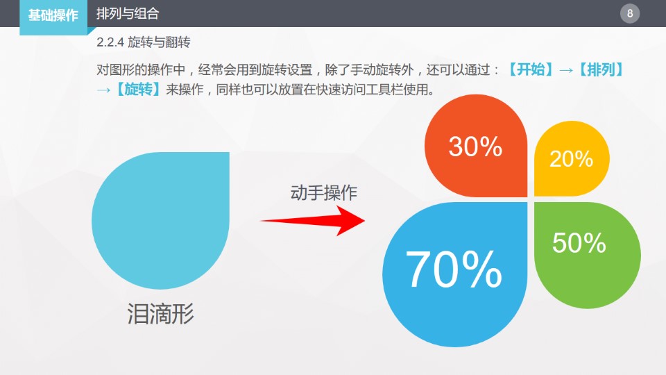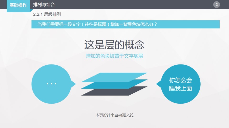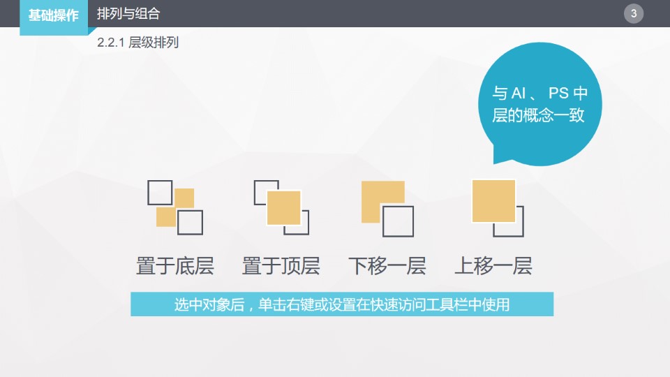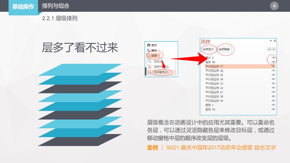 :PPT基础操作之排列与组合,2.2.1 层级排列,当我们需要把一段文字(往往是标题)增加一背景色块怎么办?选中对象后,单击右键或设置在快速访问工具栏中使用,层级概念在动画设计中的应用尤其重要。可以重命名各层,可以通过灵活隐藏各层来修改目标层,或通过移动窗格中层的顺序改变层的层级。
