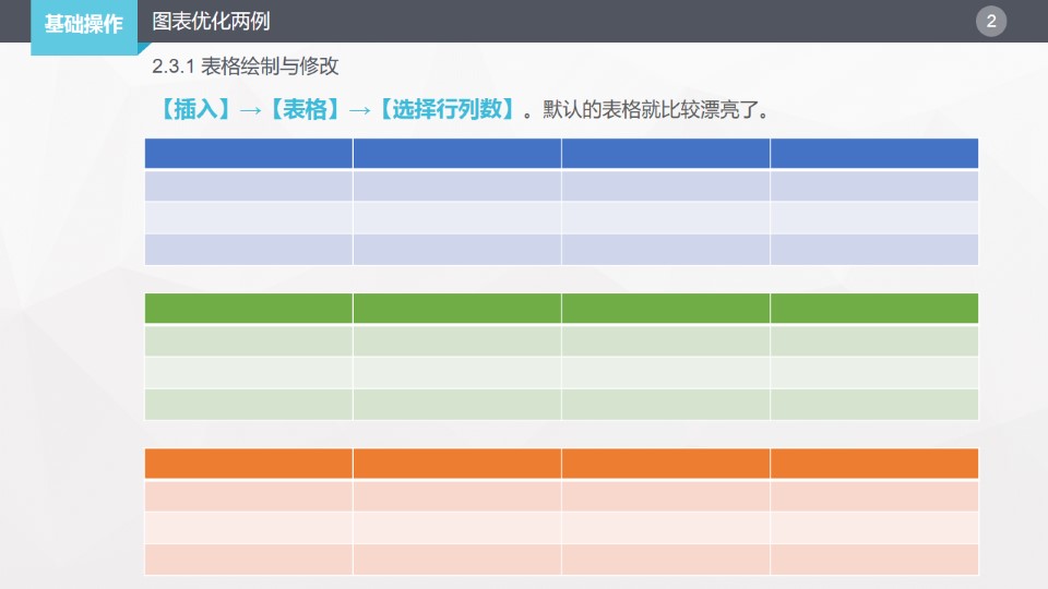 :PPT基础操作之表格美化两例:2.3.1 表格绘制与修改,【插入】→【表格】→【选择行列数】。默认的表格就比较漂亮了。表格的基本操作:修改背景与边框,合并与拆分,擦除与绘制等,我们通过以下两个案例来动手练习。