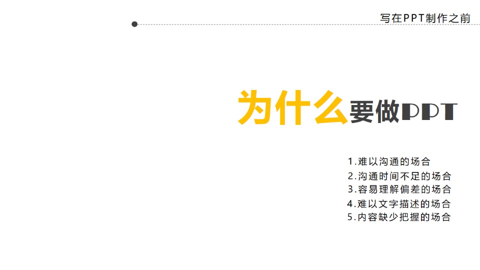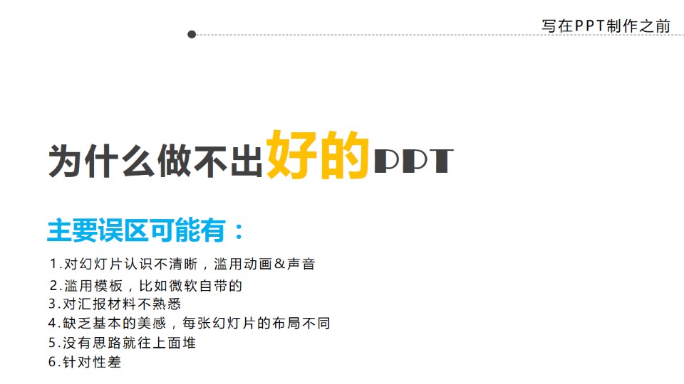 :为什么要做PPT?1.难以沟通的场合;2.沟通时间不足的场合;3.容易理解偏差的场合;4.难以文字描述的场合;5.内容缺少把握的场合;为什么做不出好的PPT?主要误区可能有:1.对幻灯片认识不清晰,滥用动画&声音;2.滥用模板,比如微软自带的;3.对汇报材料不熟悉;4.缺乏基本的美感,每张幻灯片的布局不同;5.没有思路就往上面堆;6.针对性差。