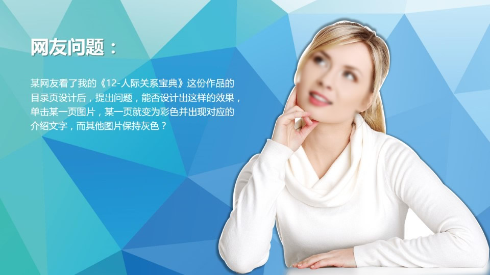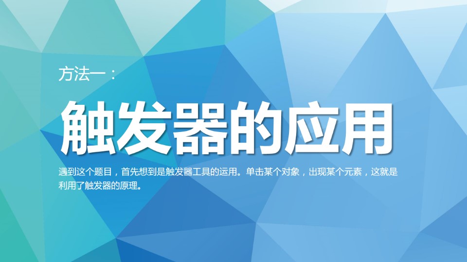 :方法一:触发器的应用,遇到这个题目,首先想到是触发器工具的运用。单击某个对象,出现某个元素,这就是利用了触发器的原理。方法二:超链接的应用,从上述展示来看,触发器略显复杂,有什么更简单的方法呢?布衣公子灵光一闪,利用超链接的设置来实现。即把目标效果设置成为独立的页面,然后通过单击灰色图片来访问对应的页面。